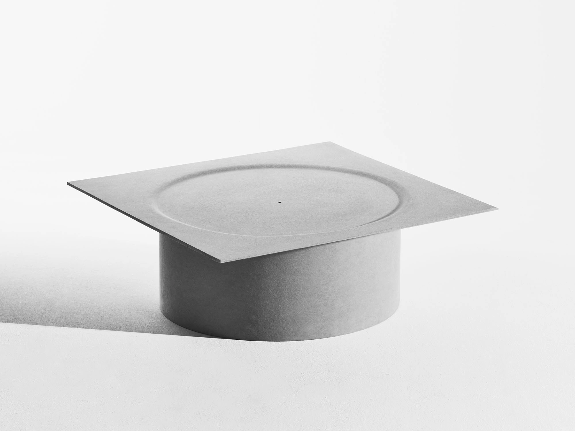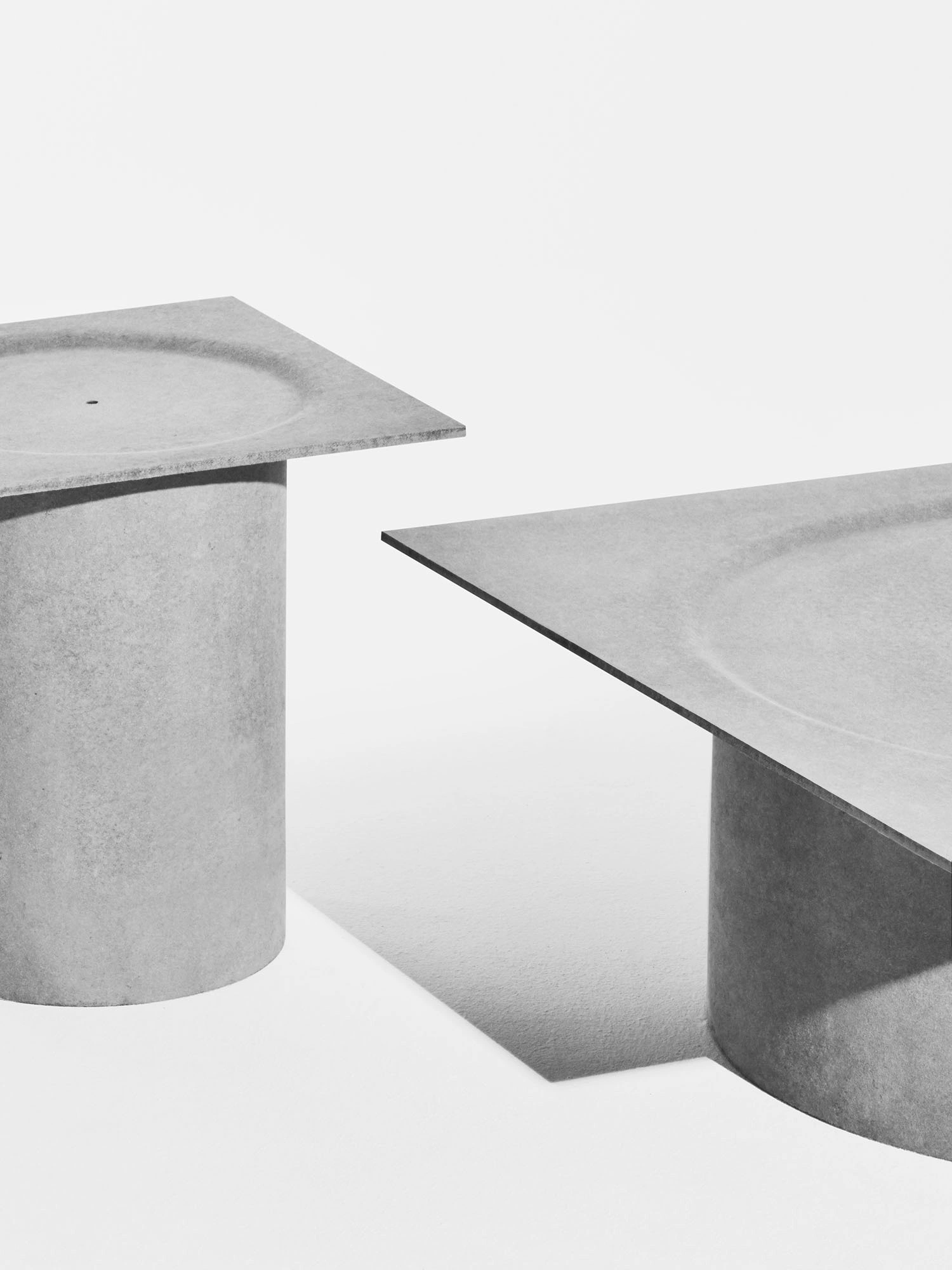 The tables are made from Eternit, a material often used in construction. Guex uses it in two different ways: a heavy, solid base that feels grounded, and a thinner top that appears light in comparison. The contrast between the two parts makes the tables feel stable yet airy, functional yet sculptural.