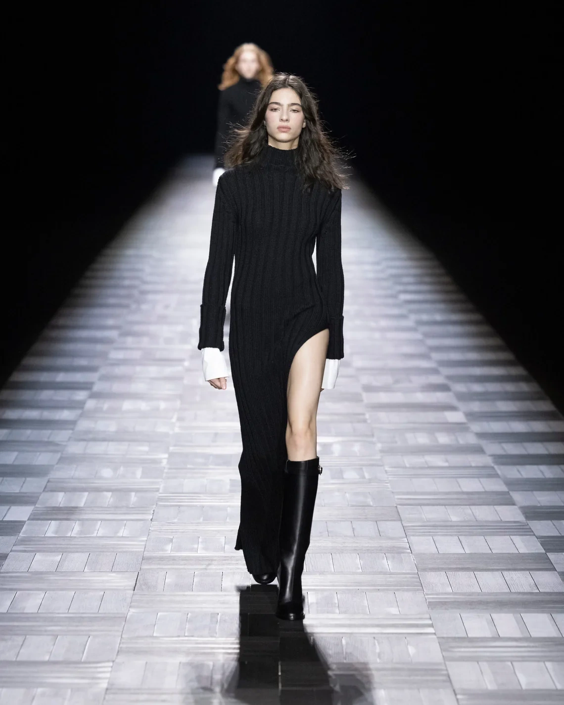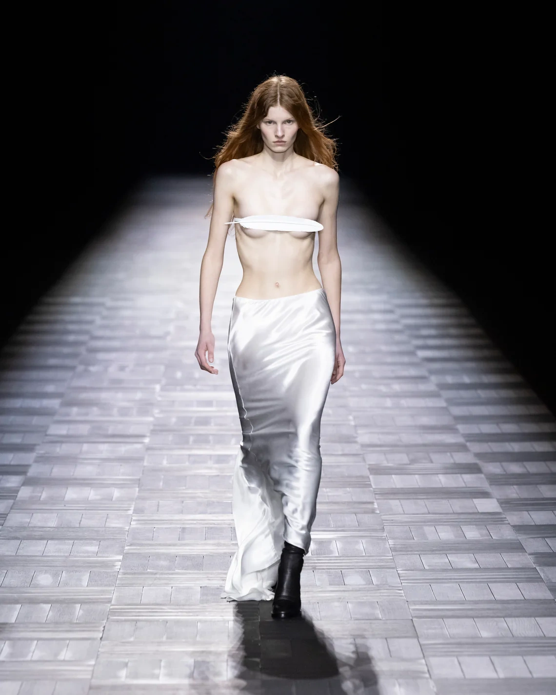 The opening look featured a single feather covering the model's chest, recreated in leather and wood rather than actual plumage. This referenced both Demeulemeester's handwritten departure letter to industry contacts in 2013 and a 1992 runway moment. Throughout, de Saint Sernin maintained the house codes: longline jackets with elbow seams, asymmetrical knits that clung to the body, and floor-length silk skirts worn by both men and women.