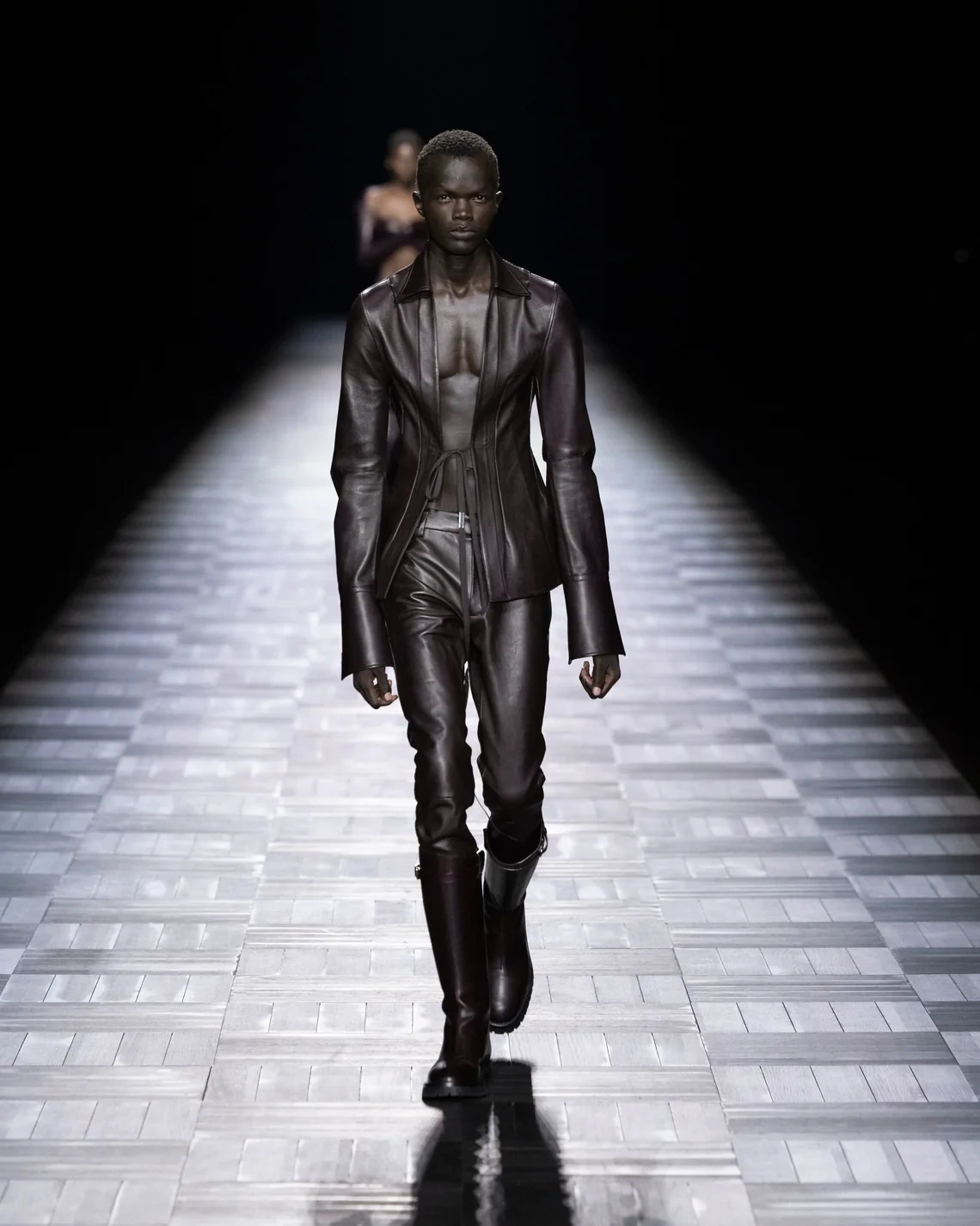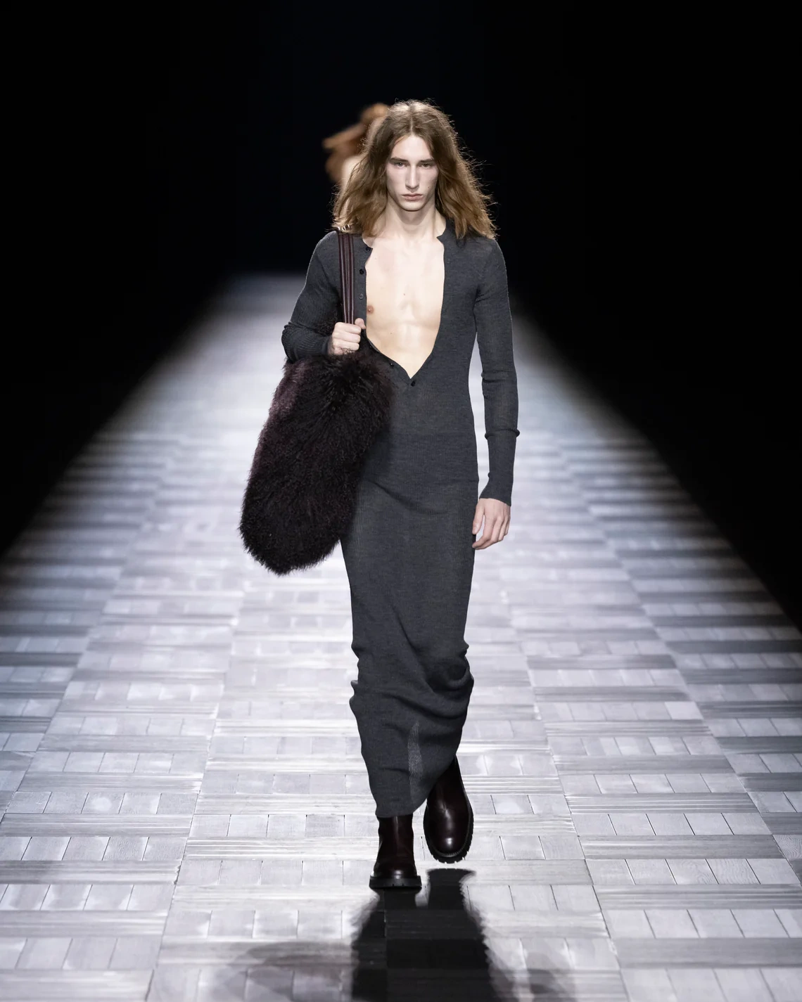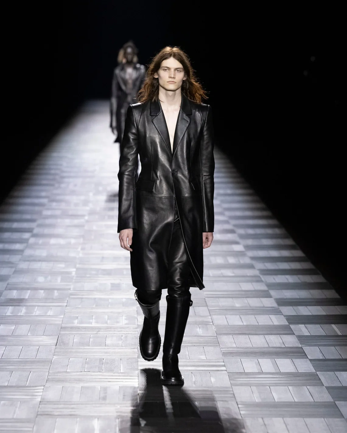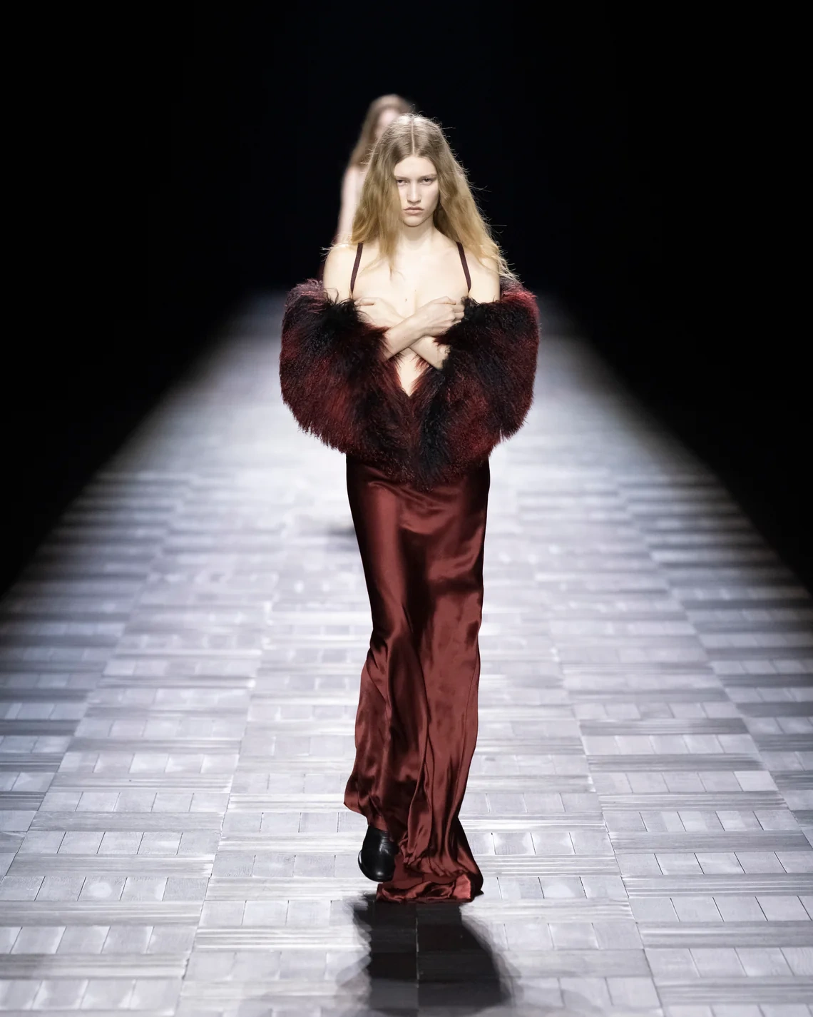 Materials included leather treated in small Italian tanneries, silk cut into billowing sleeves that pooled at the wrists, and heavy fur mantles that appeared later in the show. Footwear ranged from flat boots to stiletto versions, maintaining the brand's emphasis on statement shoes. Models of both genders wore identical looks in sequence, emphasizing the gender-fluid approach de Saint Sernin brought from his eponymous label.