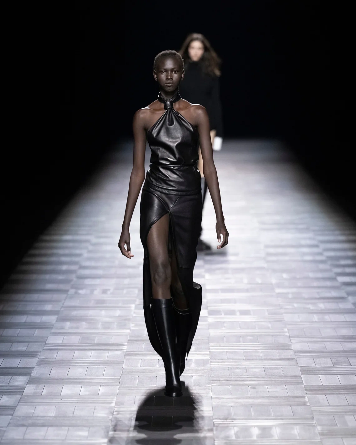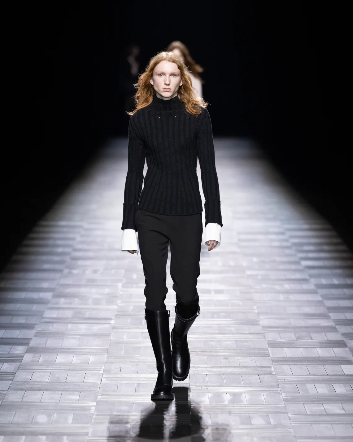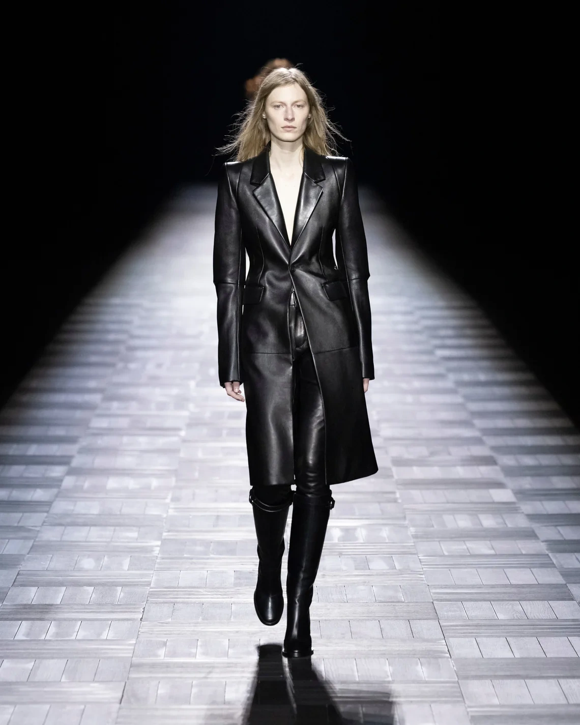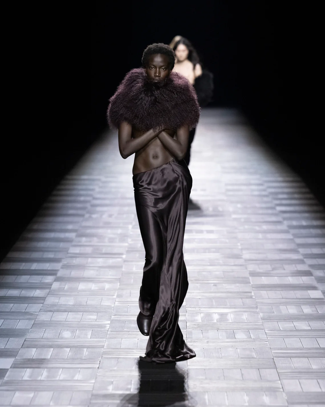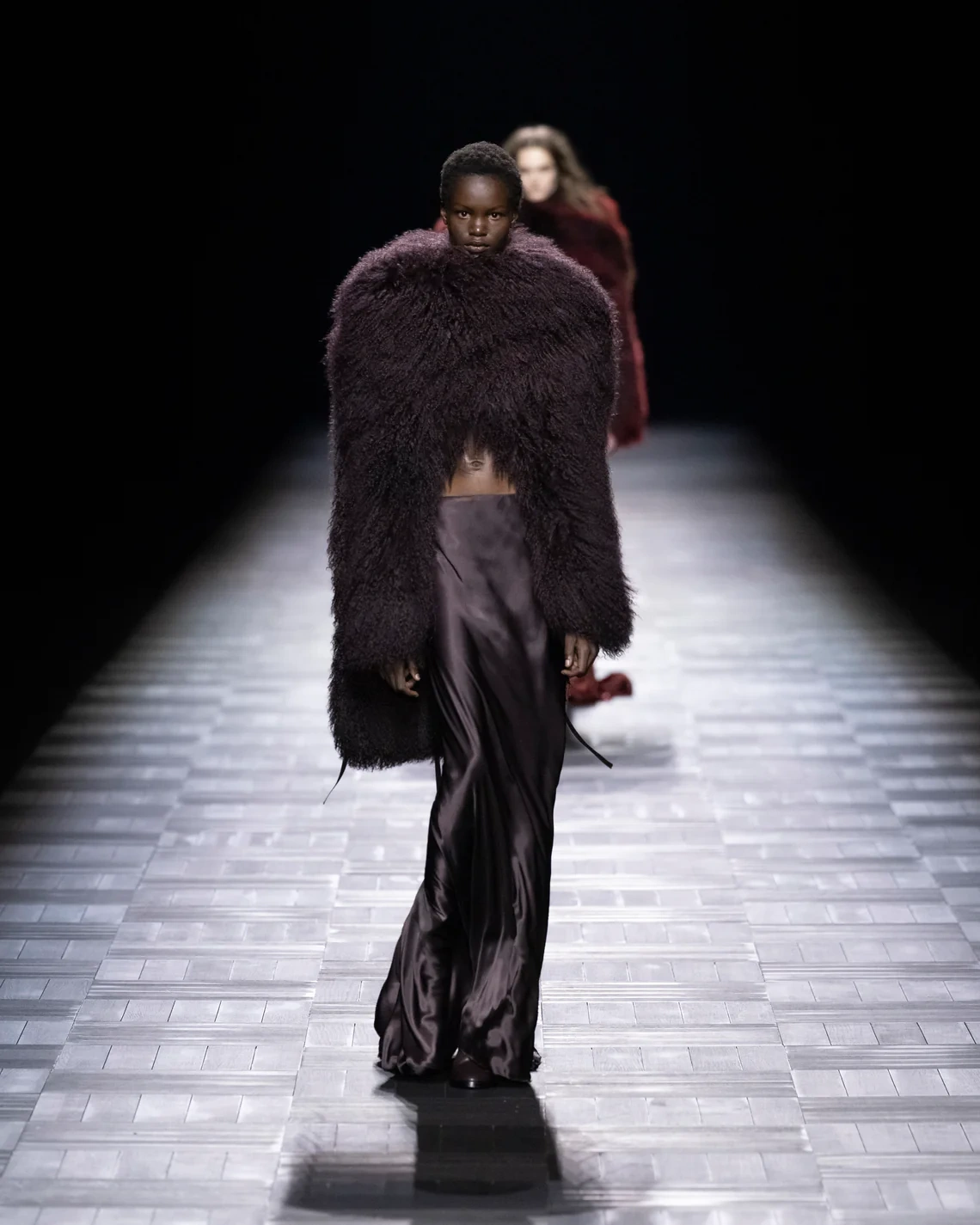 Materials included leather treated in small Italian tanneries, silk cut into billowing sleeves that pooled at the wrists, and heavy fur mantles that appeared later in the show. Footwear ranged from flat boots to stiletto versions, maintaining the brand's emphasis on statement shoes. Models of both genders wore identical looks in sequence, emphasizing the gender-fluid approach de Saint Sernin brought from his eponymous label.