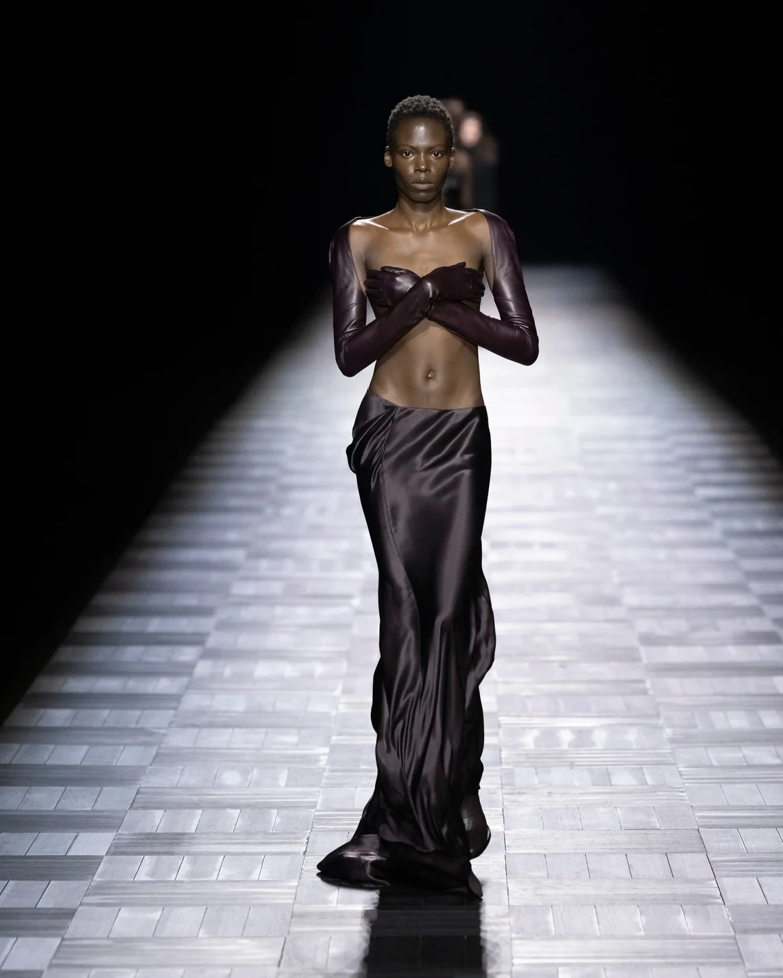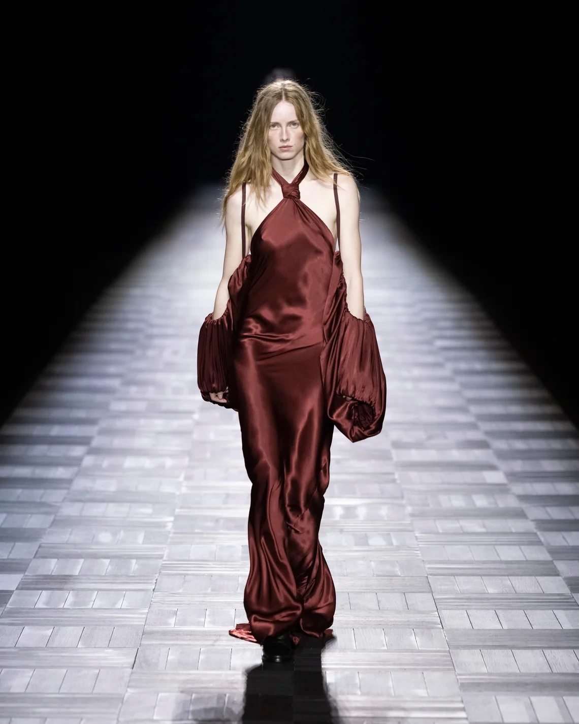Equestrian references threaded through the collection via saddlery-inspired hardware and stitching details on leather pieces. The color palette expanded from signature black into what de Saint Sernin called "faux blacks": burgundy and aubergine. Knits were cut to create liquid draping effects, while tailoring came in both structured wool and transparent organza that revealed construction details underneath.