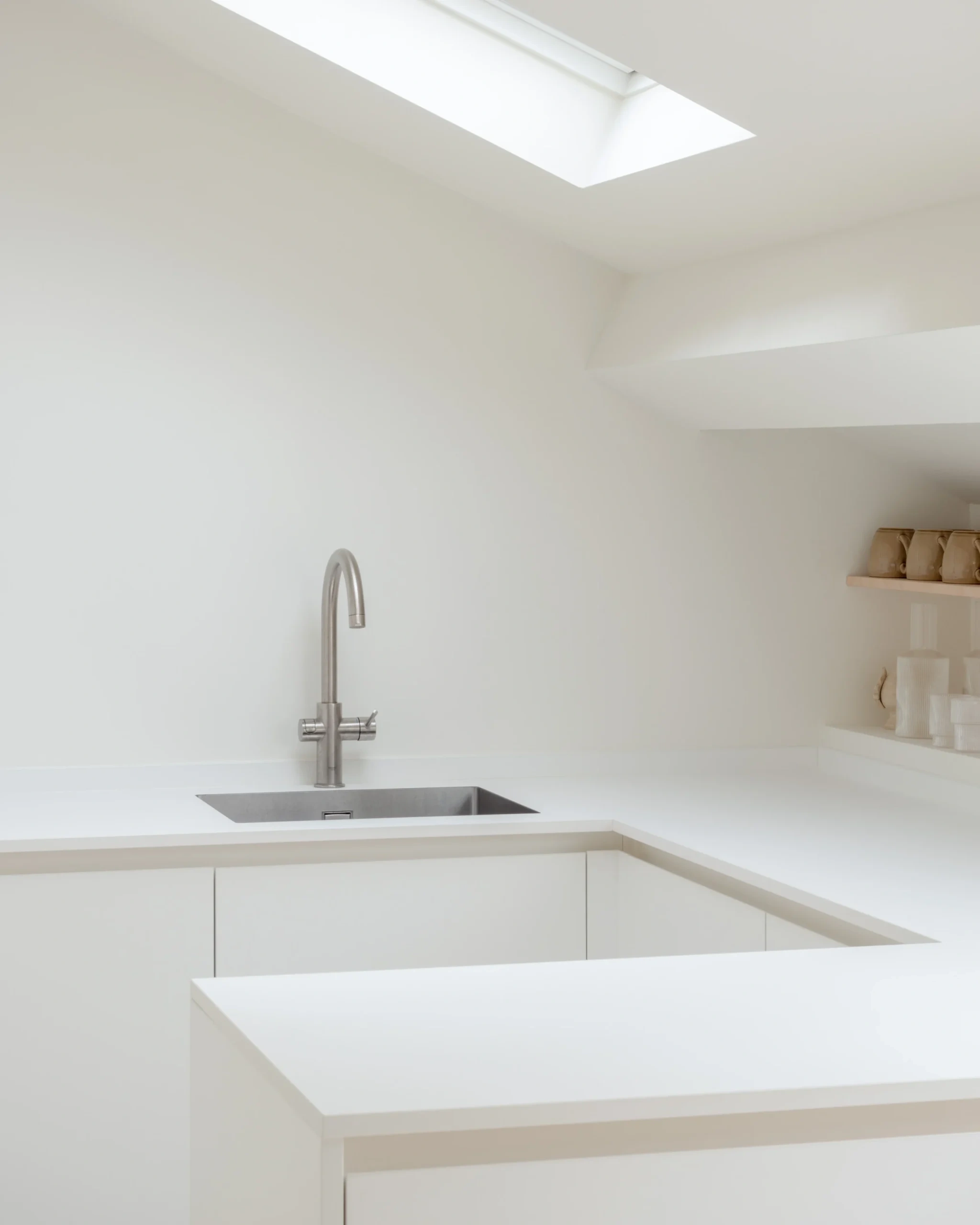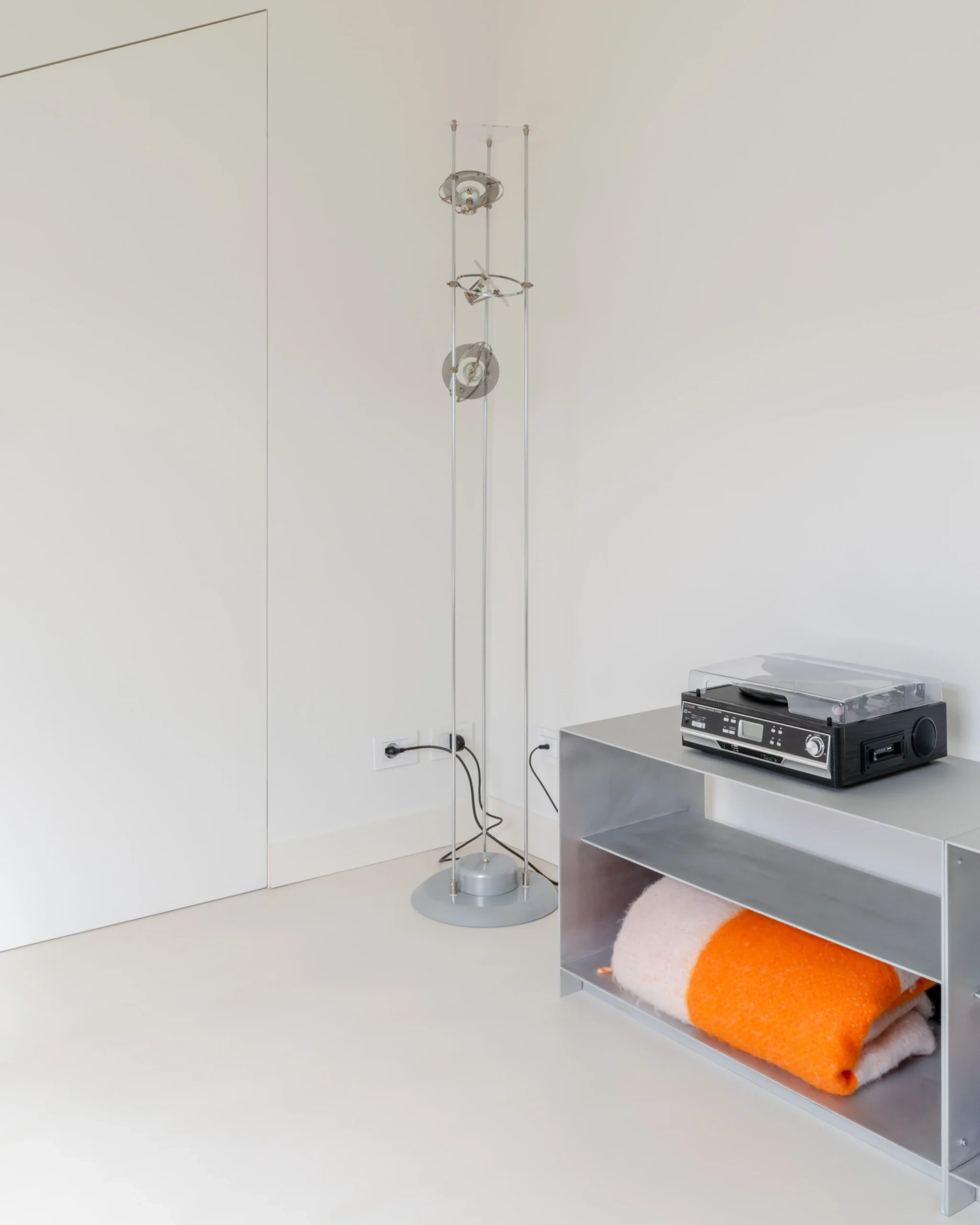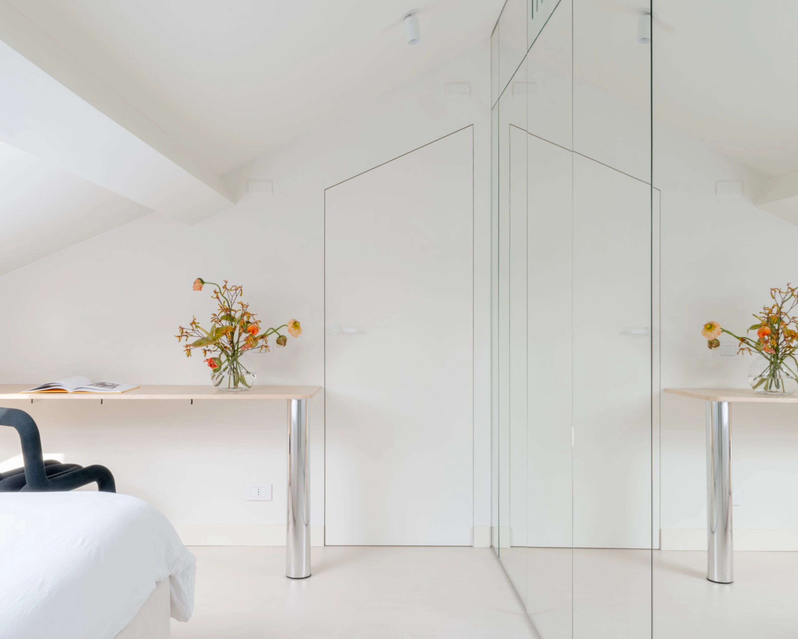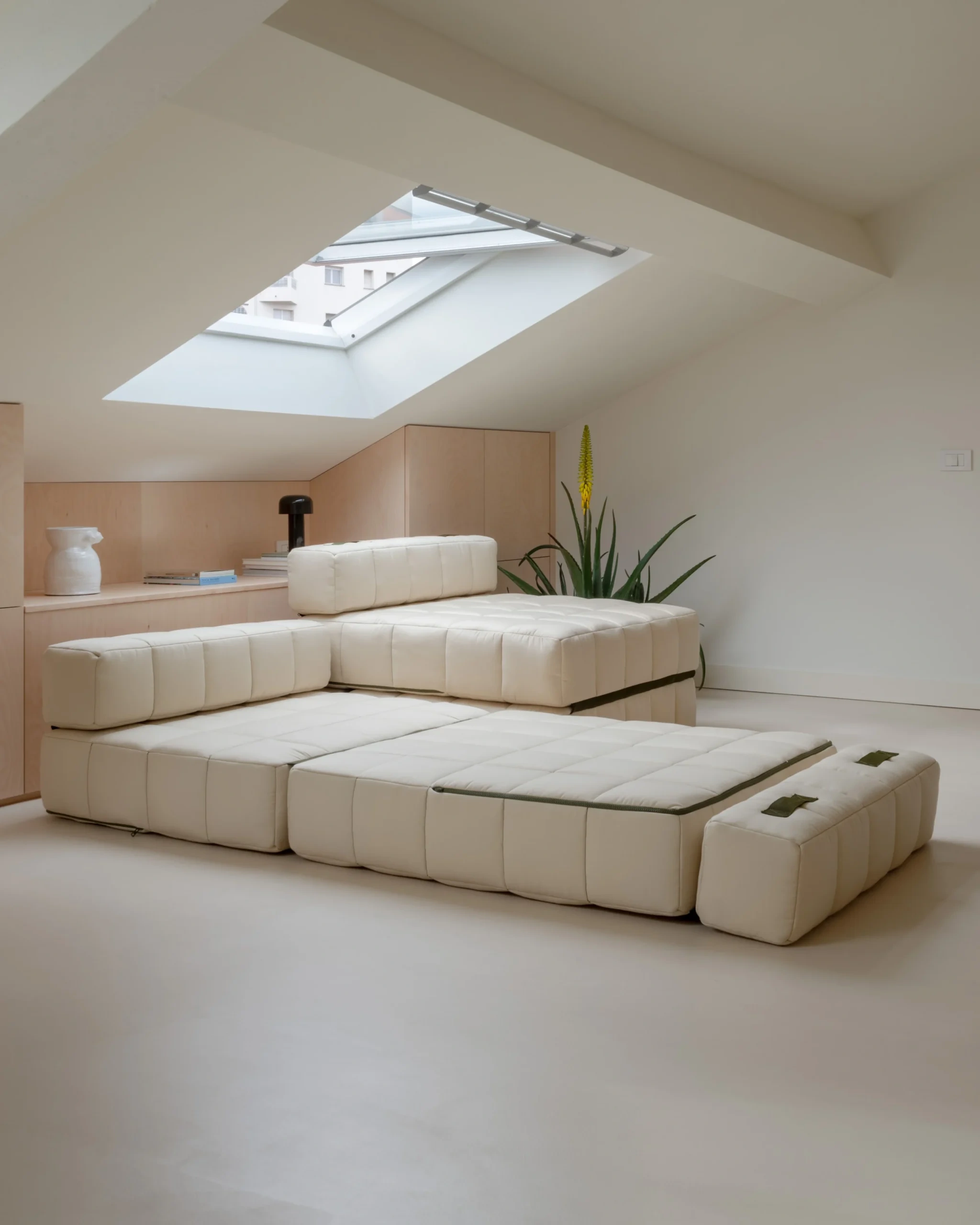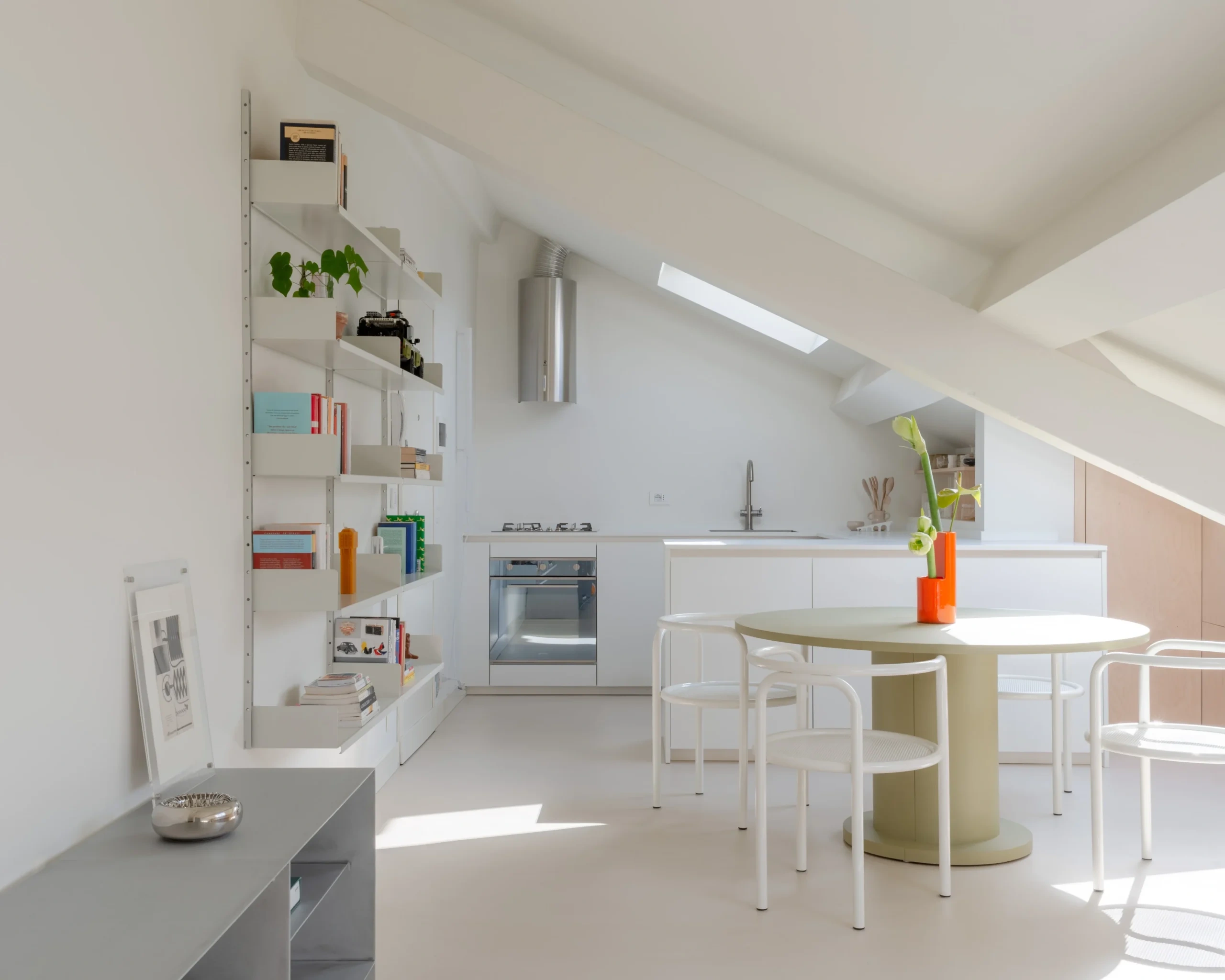 Etiam Studio designed Casa Moe for a young woman in Milan, Italy. The south-facing apartment features five skylights that flood the interior with natural light throughout the day. Each room functions as multi-purpose space to maximize the compact urban footprint.