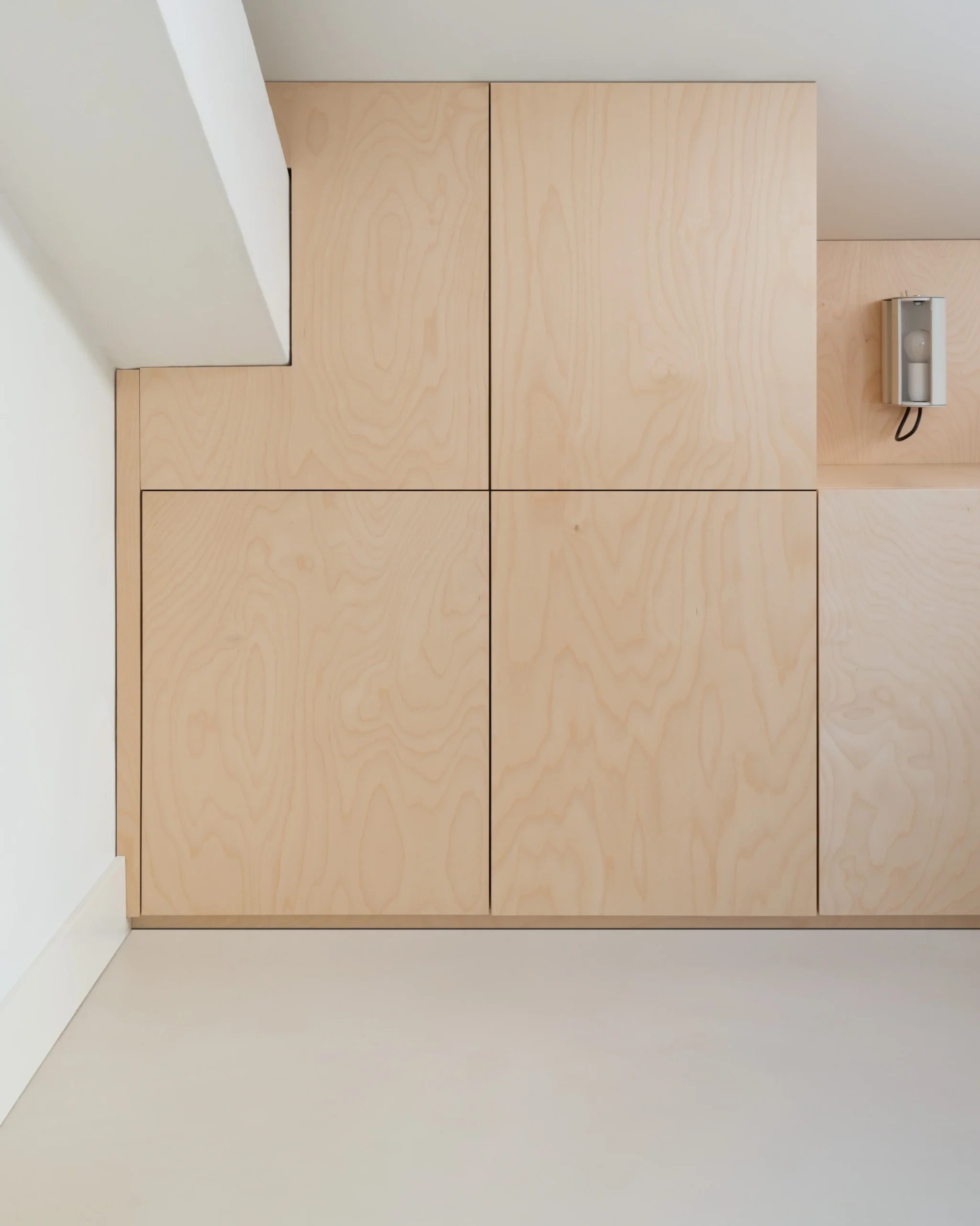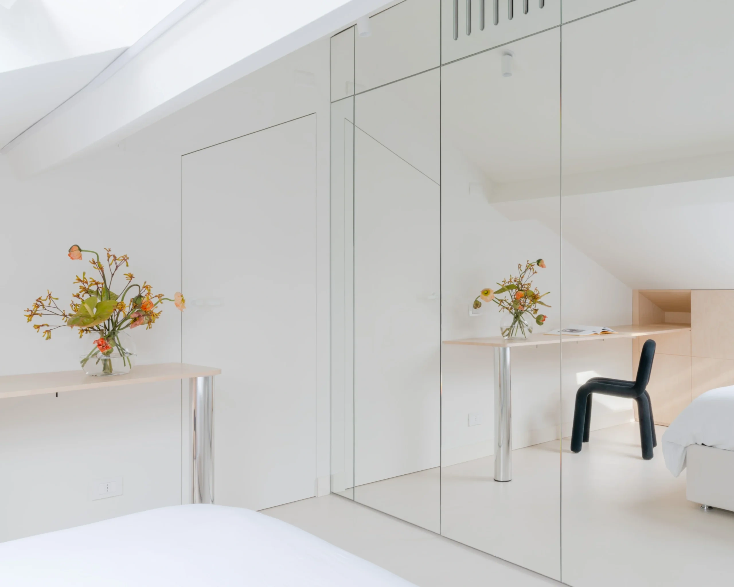 The bedroom includes a built-in mirrored wardrobe that amplifies natural light from the skylights. Decorative carved details conceal an air conditioning unit. The bathroom features rectangular striped tiles and integrates a hidden laundry room within the birch cabinetry.