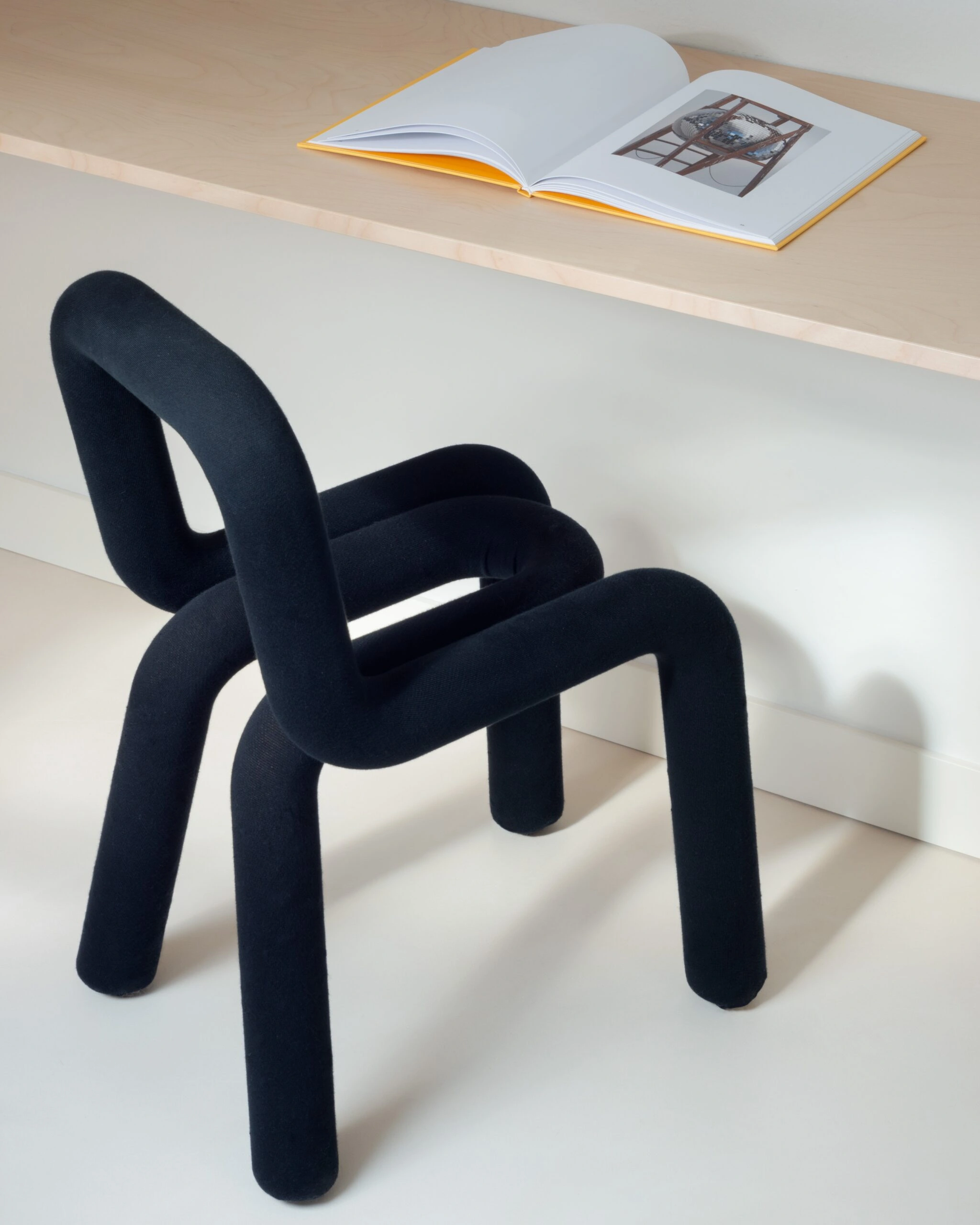A custom birch wood furniture element spans from the living area into the bathroom, emphasizing the apartment's lower perimeter zones. The centerpiece is a transformable sofa designed by Etiam Studio that converts into a 2x2 meter bed using overhead straps. The camping-inspired design uses two blocks that occupants can reconfigure as needed.