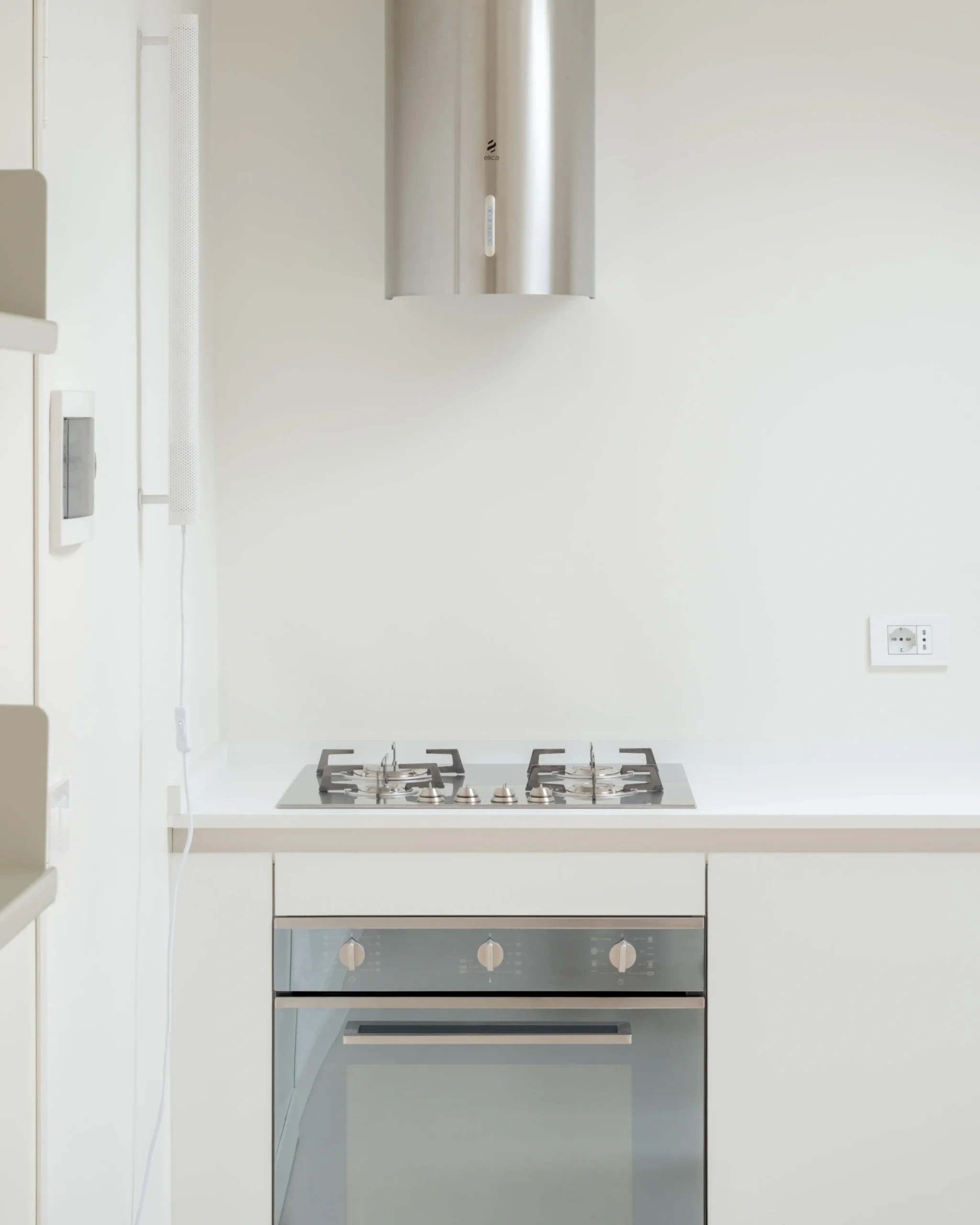 The entrance opens to a C-shaped kitchen that flows directly into the dining area. Resin flooring in calming tones unifies the spaces and provides easy maintenance. The design preserves the apartment's original structure while optimizing varying ceiling heights throughout the historical building.