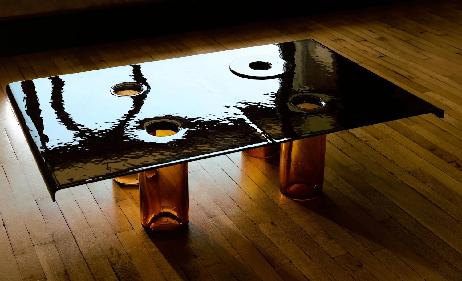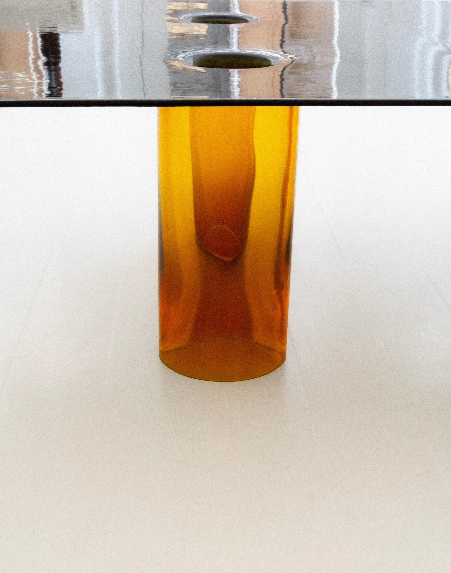 Blown glass supports meet flat glass tops in a Corbusier-inspired design