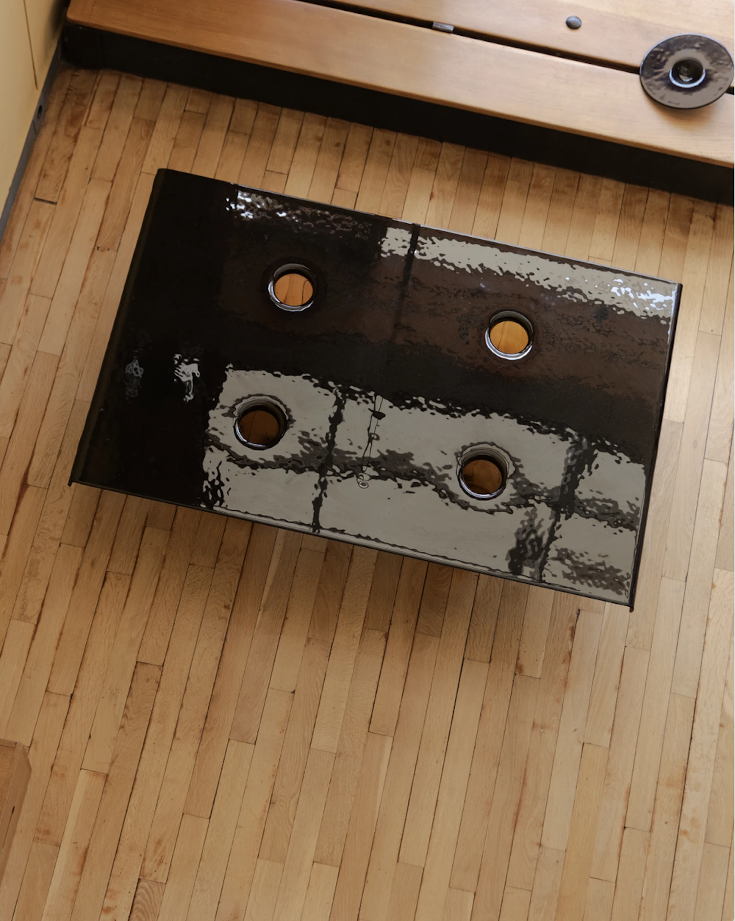 Marie and Alexandre collaborate with glassmakers, ceramists, and carpenters. Their work combines industrial techniques with handcraft methods across objects and textiles. Materials include clay, glass, wood, and lava. The CR Coffee Table references Le Corbusier's use of color and modular thinking through its colored glass components and standardized forms.