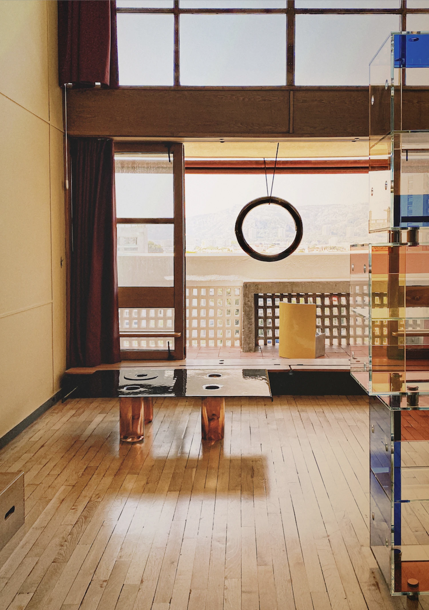 The table belongs to a larger body of work that includes the Végétasia vases developed with botanist Marc Jeanson, the Berries lighting series in speckled blown glass, Horizon lamps, and Iris mirrors. The pieces respond to the raw concrete architecture of Cité Radieuse while drawing from Mediterranean modernist precedents.