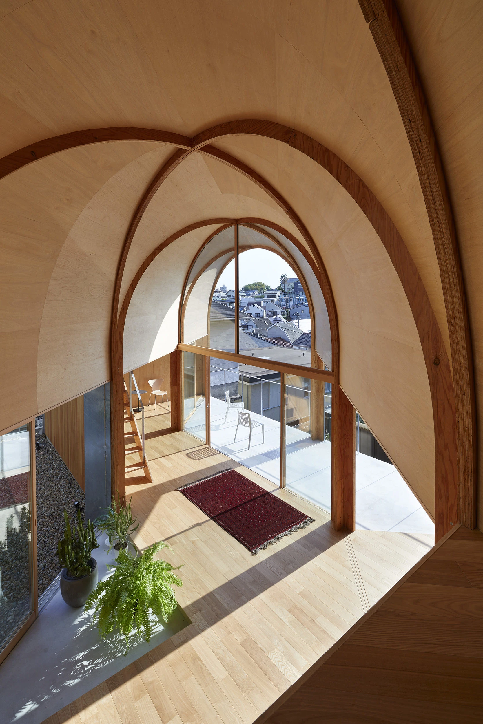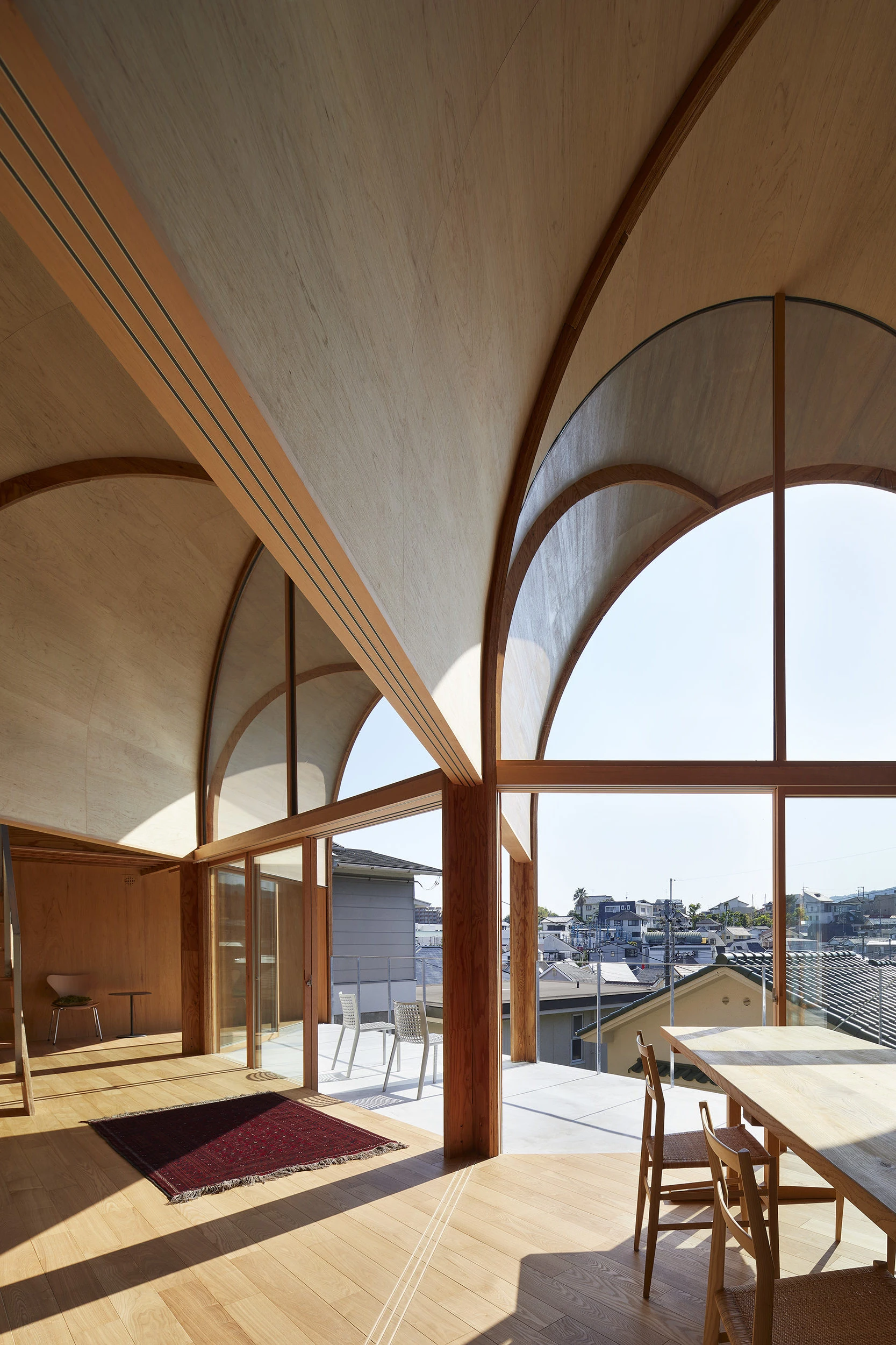 The house uses wooden arches arranged back to back in cross-shaped columns. These repeated structural elements create an open frame that responds to the site's multiple levels and directions. The small wooden members assemble into a larger system that connects to the surrounding slopes and pathways rather than standing separate from them.