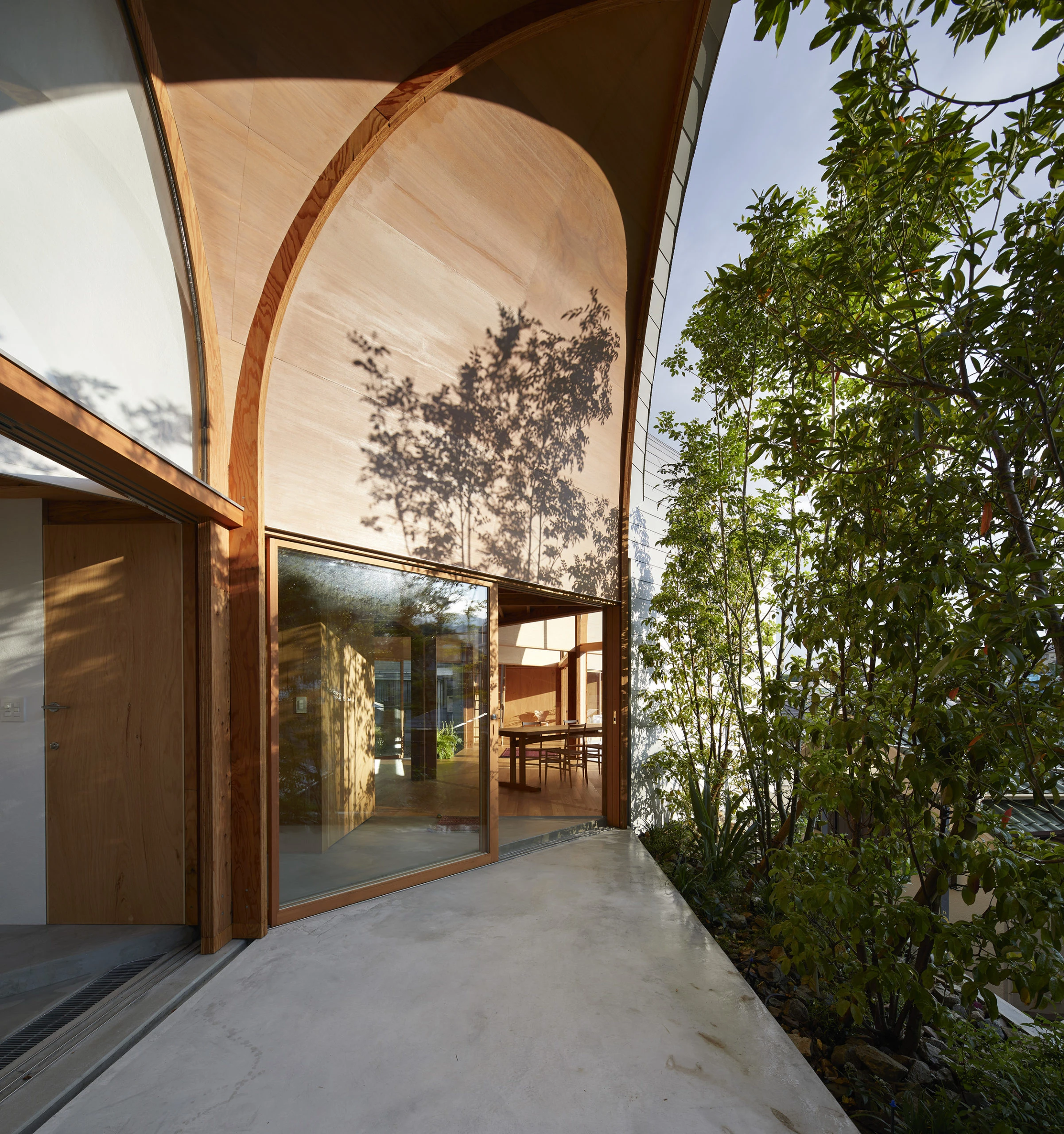 Tomohiro Hata Architect and Associates designed House in Koyoen for a site in Koyoen, Japan, where retaining walls and winding roads define the neighborhood. The area developed over time through successive construction, leaving walls of varying ages that shape how residents move through the terrain.