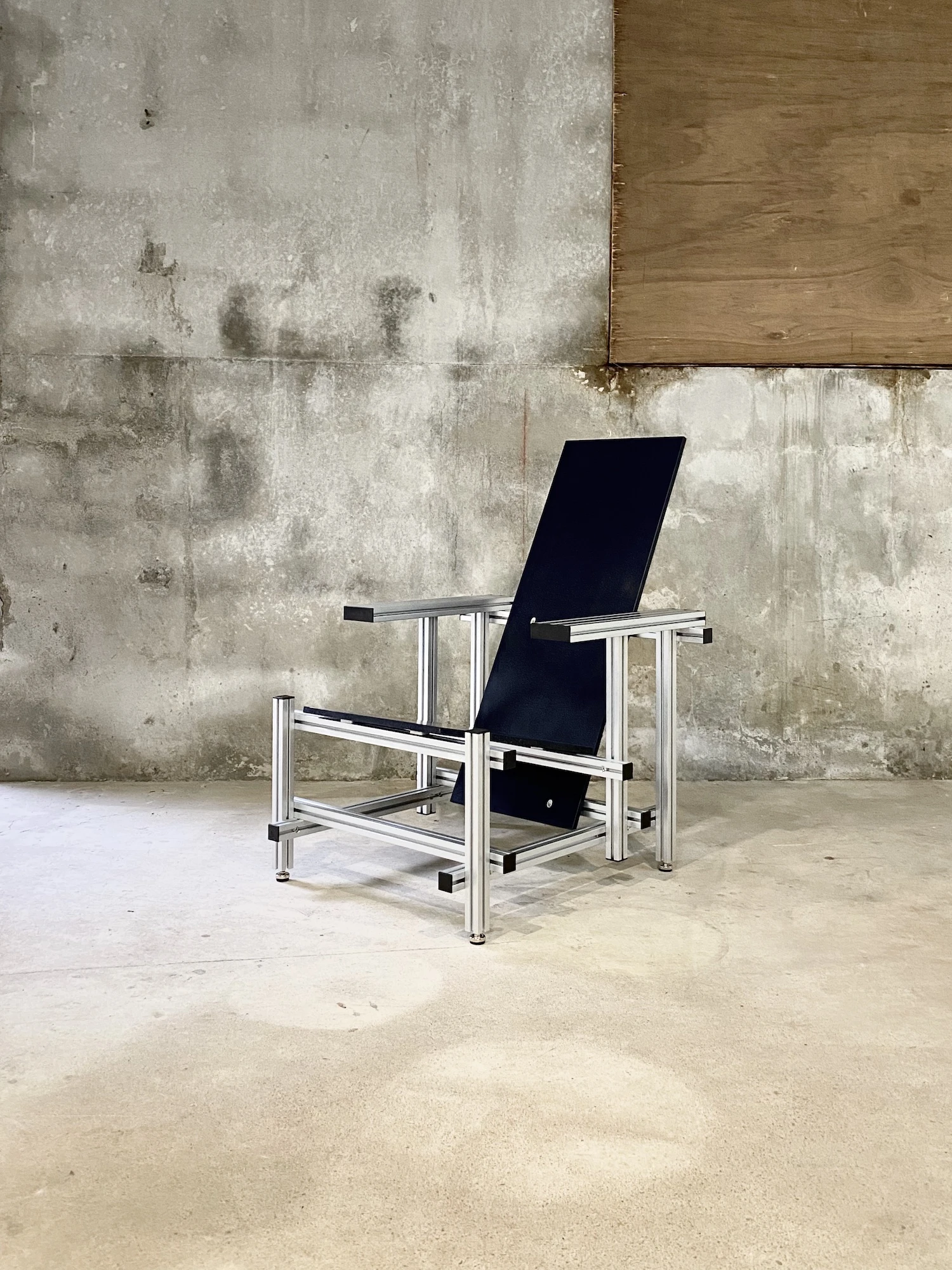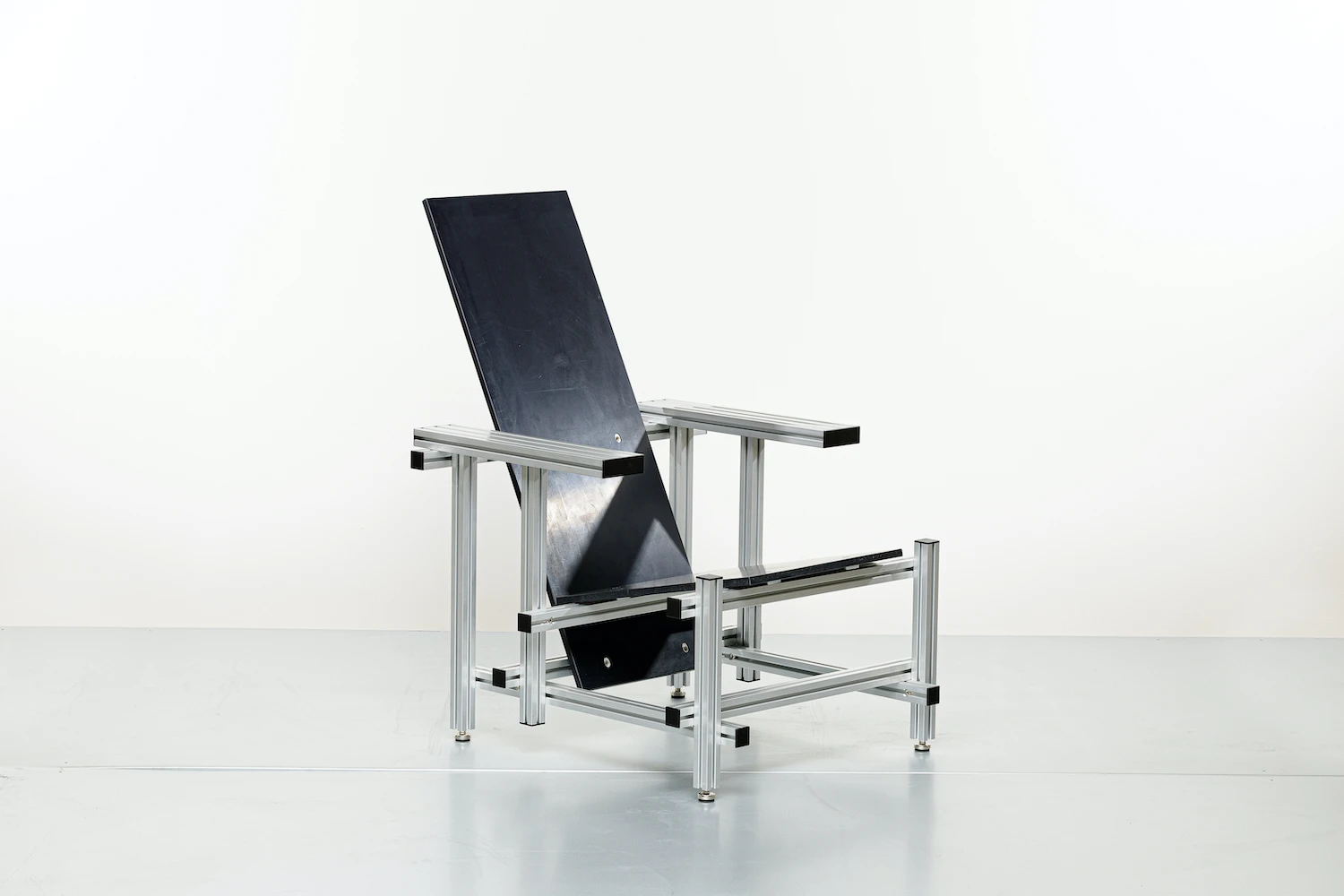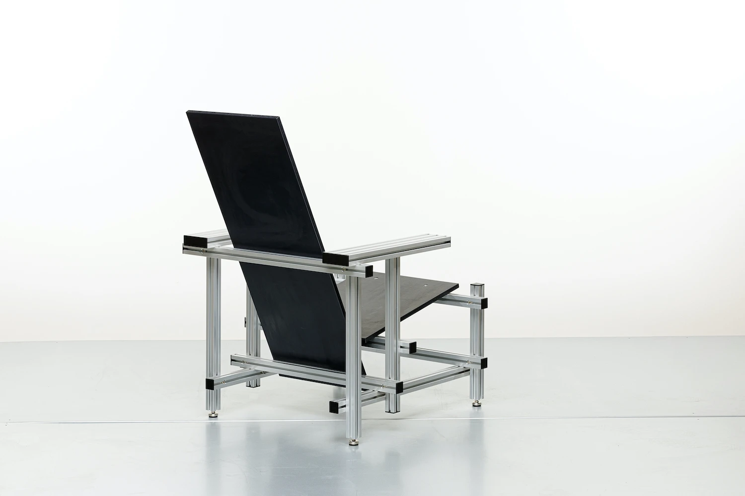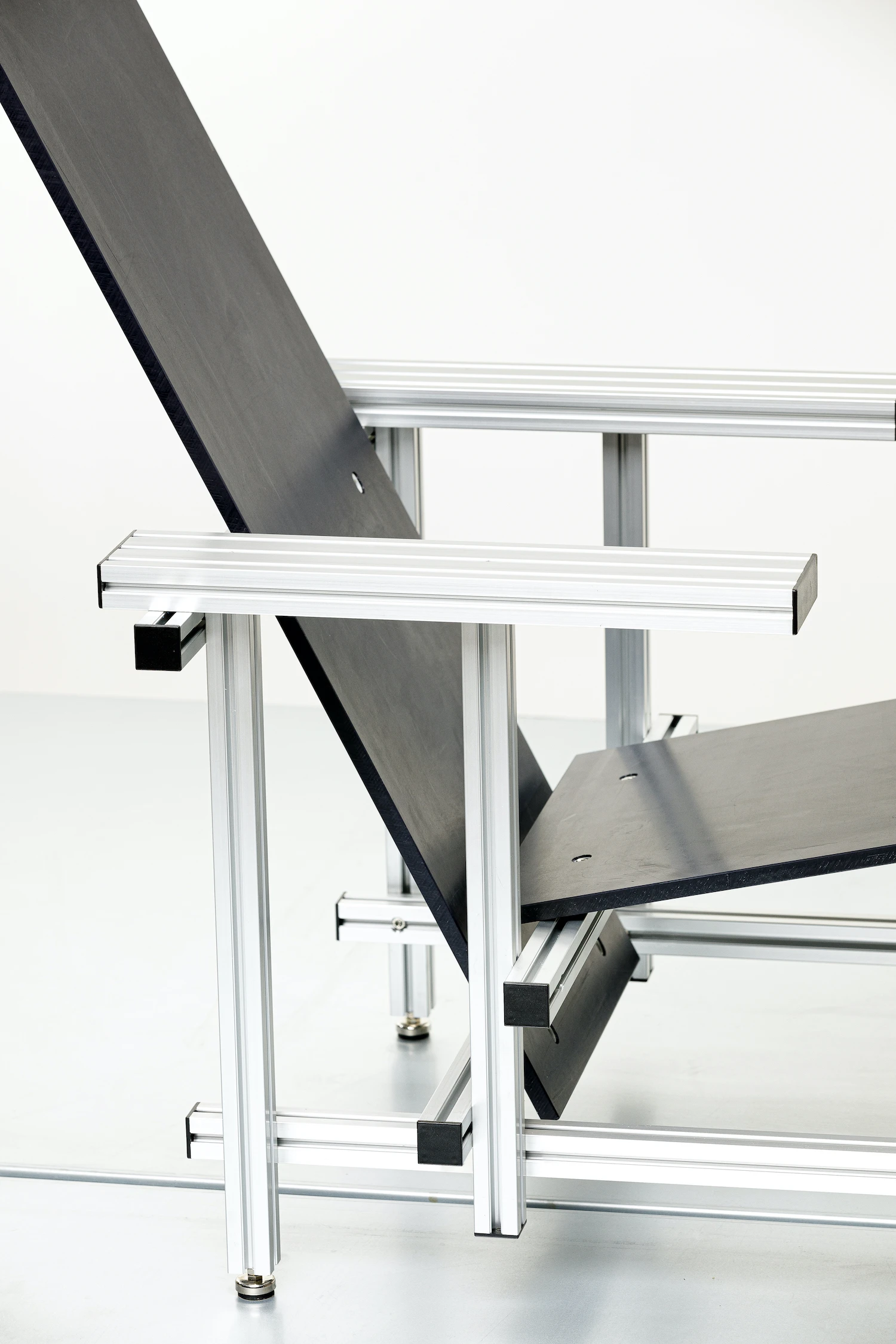 Rietveld designed his chair in 1918 for mass production using readily available parts. TIEL applies that same logic with contemporary materials and manufacturing methods. The aluminum extrusion system makes the structure more rigid than wood while allowing disassembly.