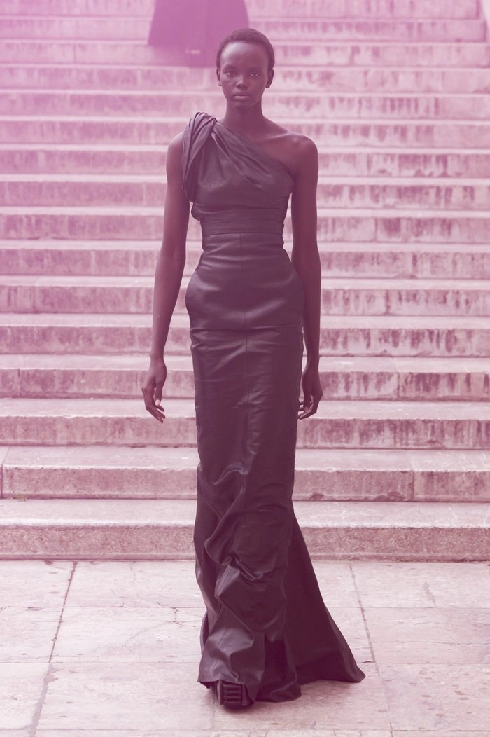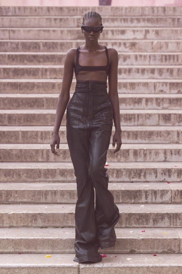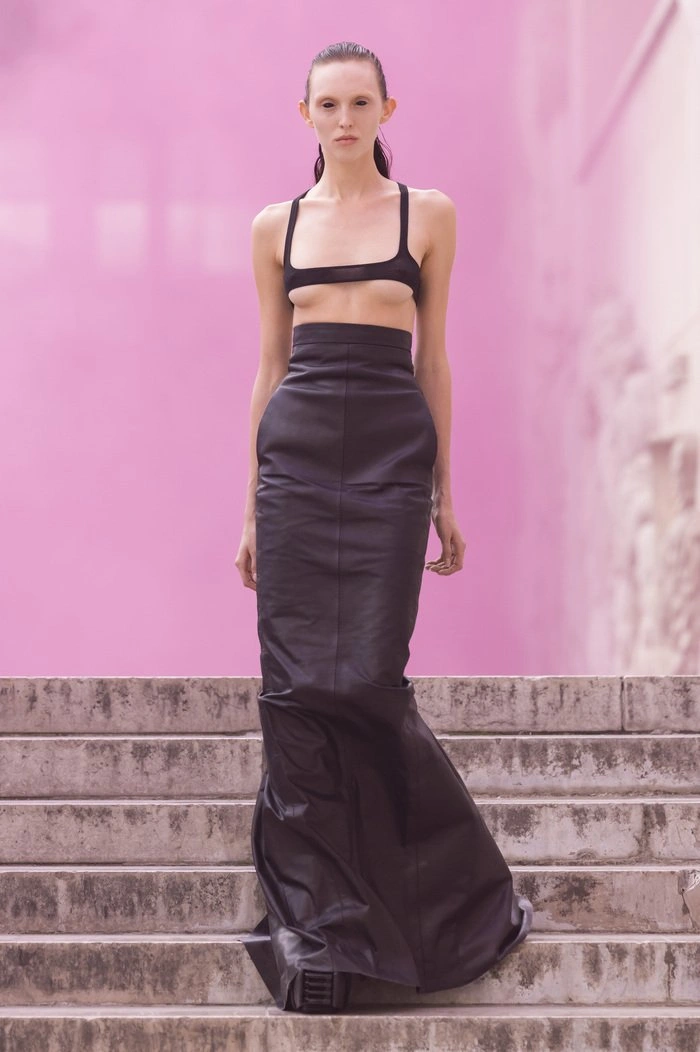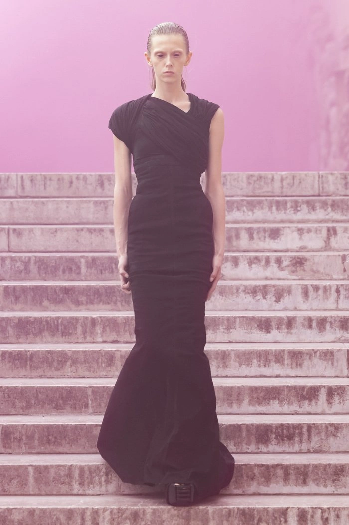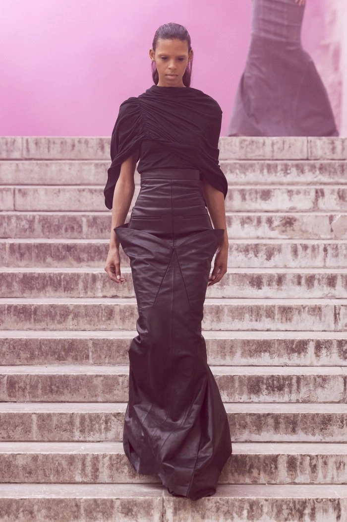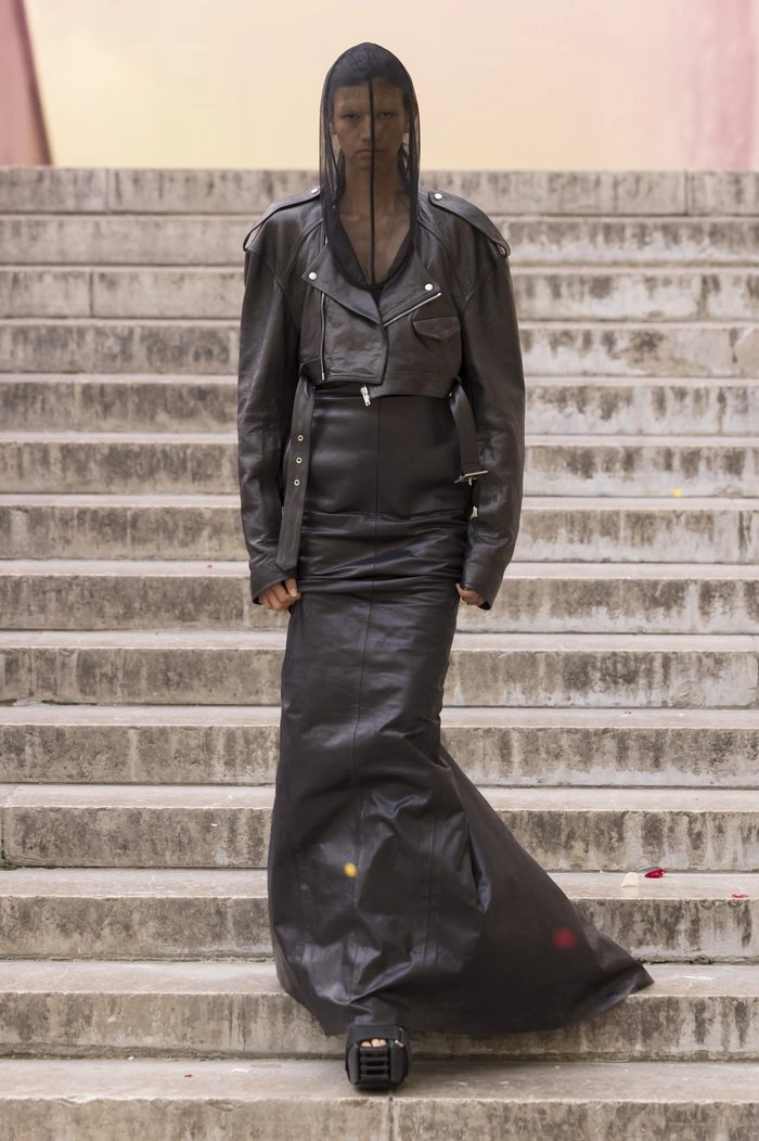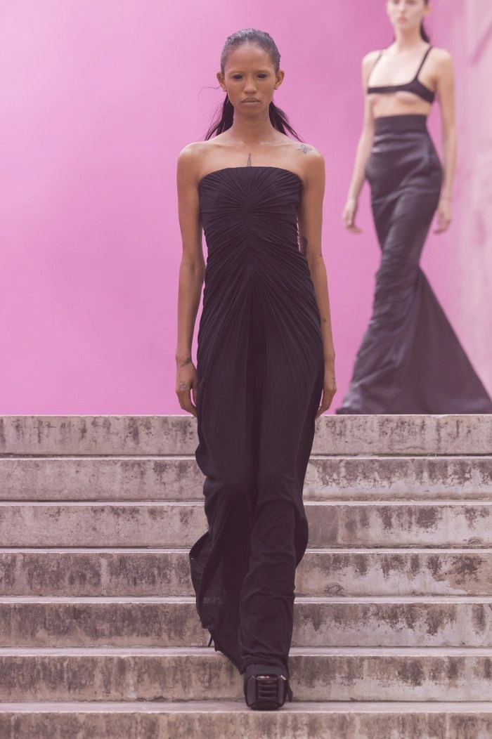 Rick Owens presented his Spring/Summer 2024 women's collection at Palais de Tokyo in Paris, returning to his regular venue after a brief excursion to Venice. The collection, titled Lido, explored what Owens called "joy as a moral obligation" through predominantly black garments that balanced severity with movement.