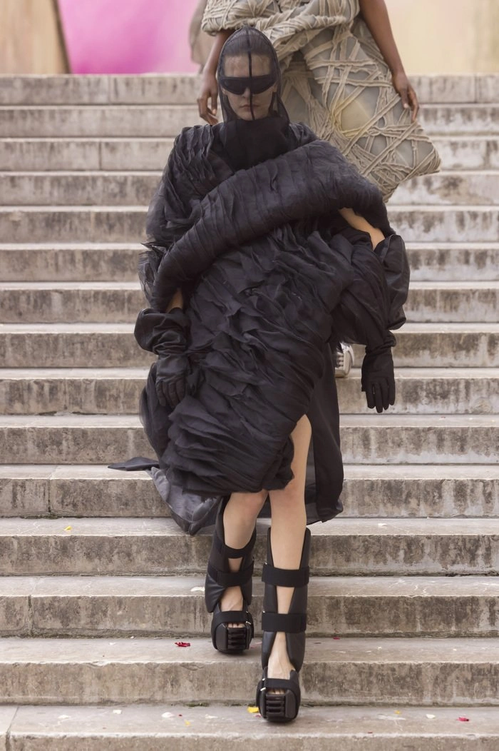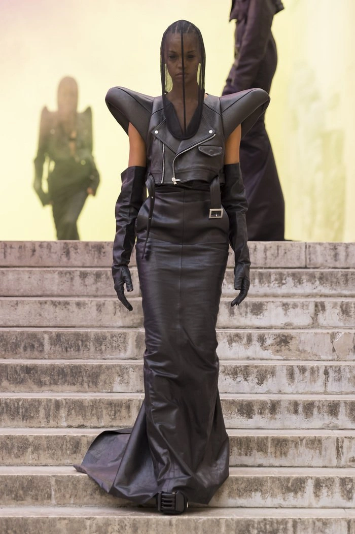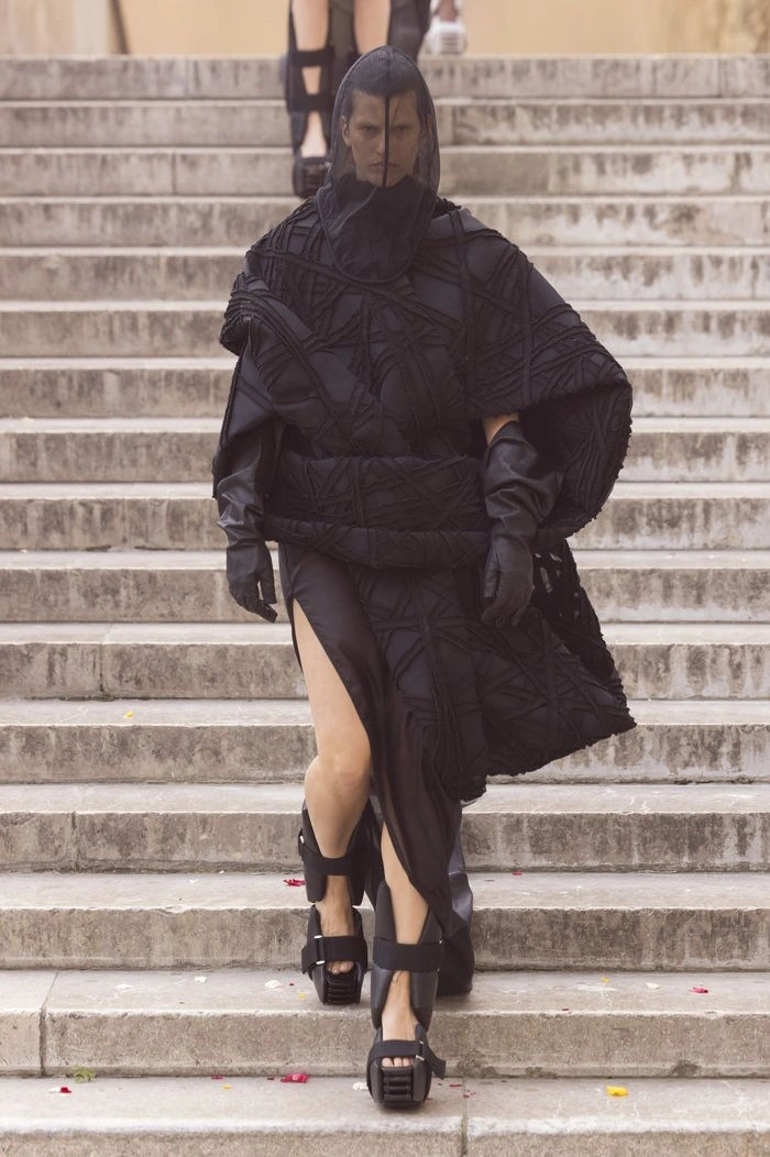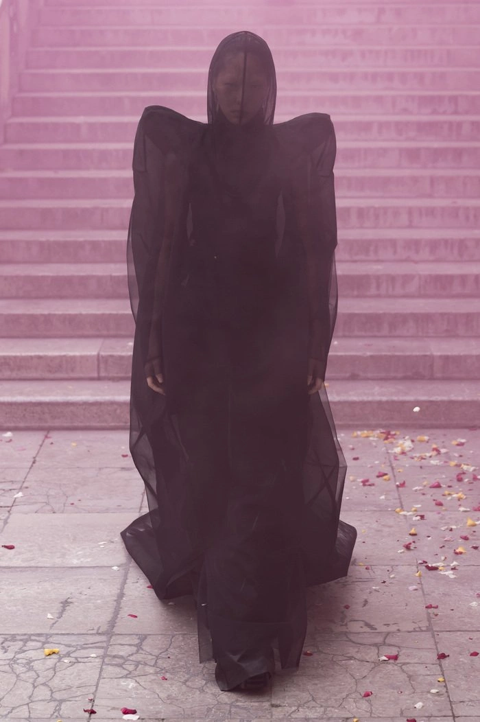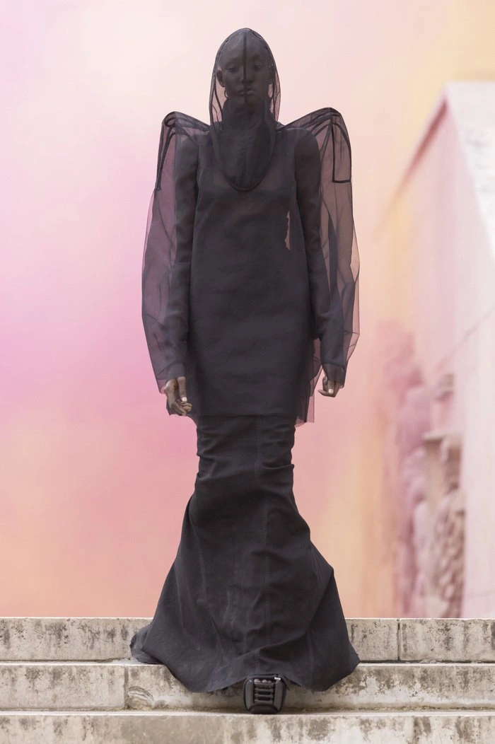 Lido marked a shift in Owens' approach. While maintaining his dark aesthetic vocabulary, the collection incorporated subtle color: beige, pale pink, desert orange alongside the dominant black. The transparency and lightness of materials suggested vulnerability beneath the armor of his typical silhouettes. This was Owens processing global uncertainty through fashion, proposing elegance as resistance.
