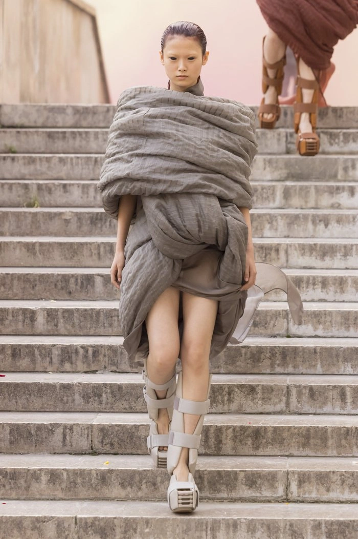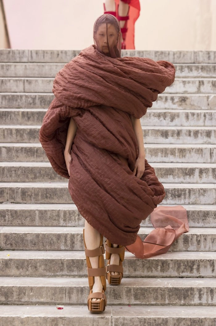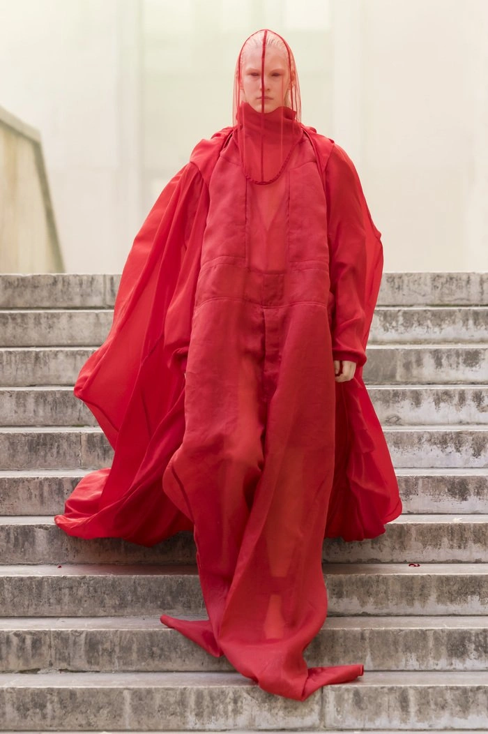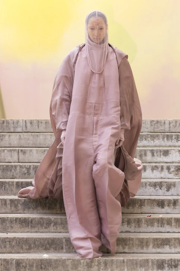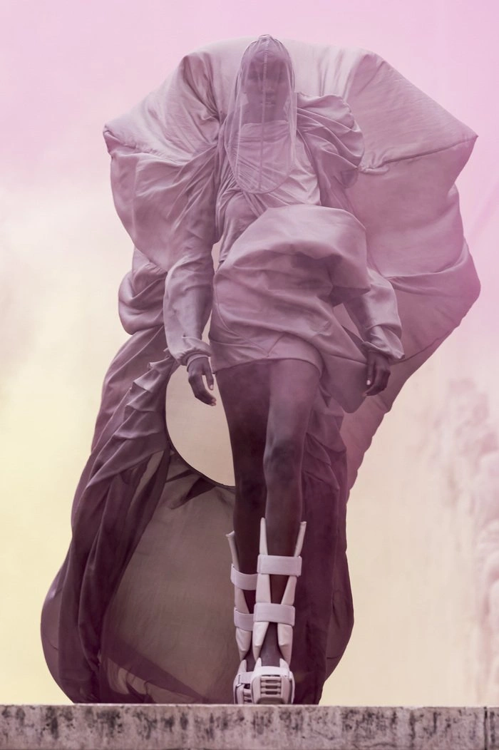 The show's climax featured billowing pieces in habotai silk, a material typically reserved for linings. Tunics, robes, and parkas moved constantly around the body, crafted from silk woven in Como and weighing almost nothing. Models wore radical boots resembling pneumatic walking braces, while translucent veils covered many faces without truly concealing them. The staging included colored smoke in pink and yellow, creating an otherworldly atmosphere against the brutalist courtyard.