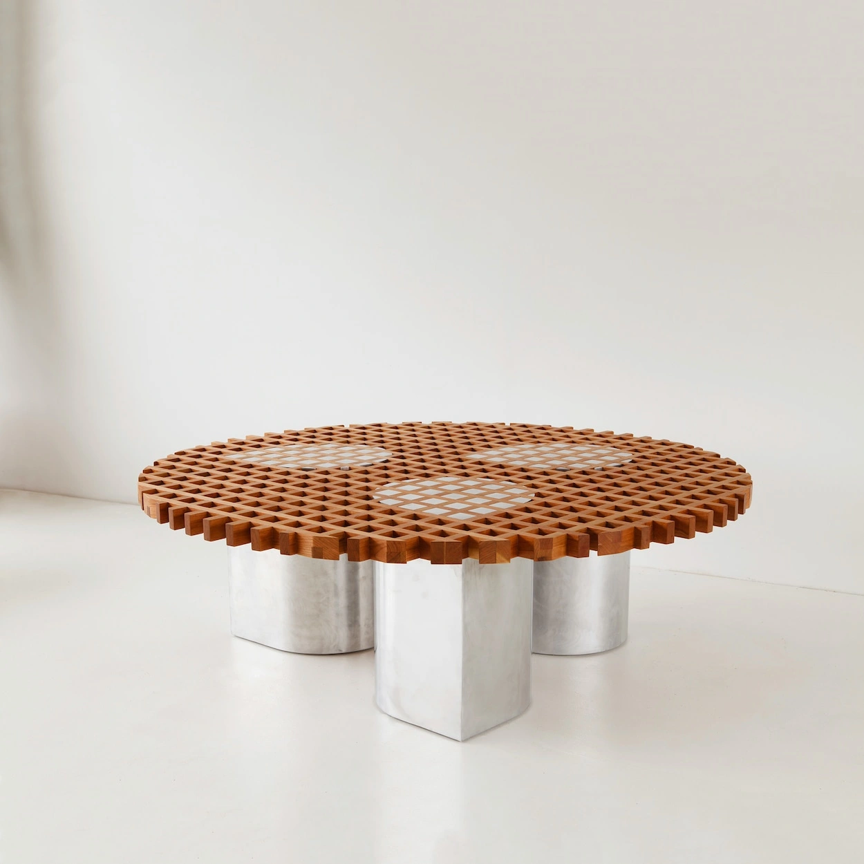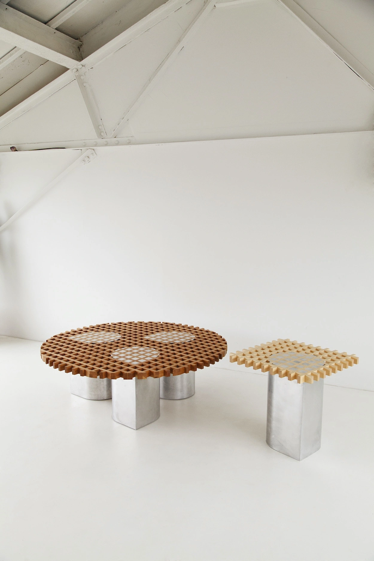 The original fabric used a simple cross-hatch grid, broken by incomplete voids that looked like frayed edges. The table translates that language into furniture: a surface that feels both structured and slightly undone. Aluminum support volumes pierce through the grid, creating new patterns where the voids once were.