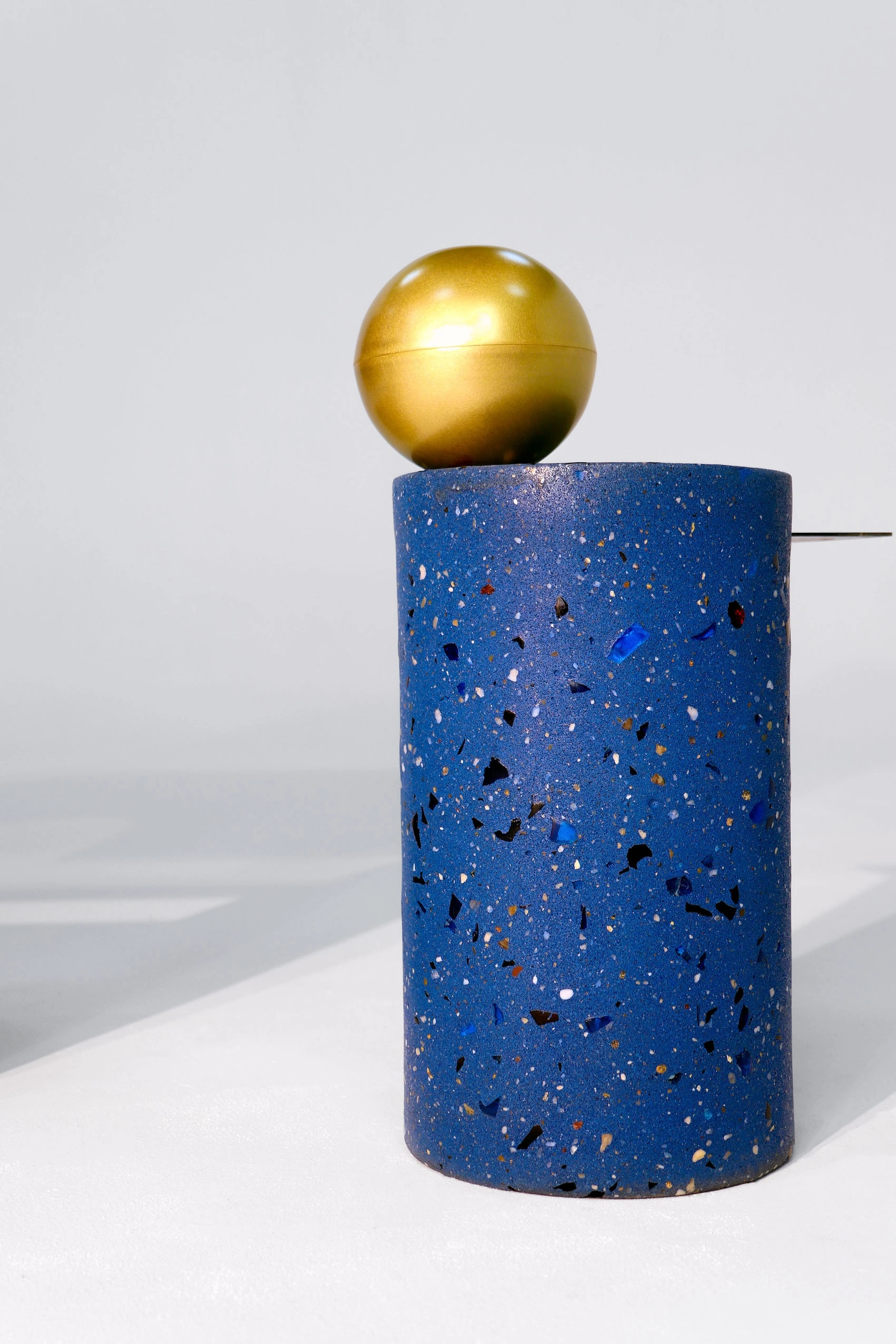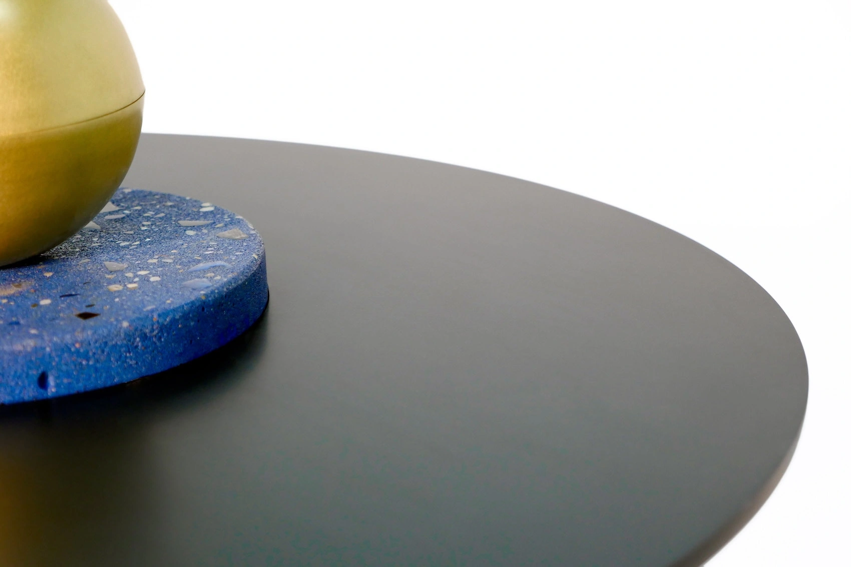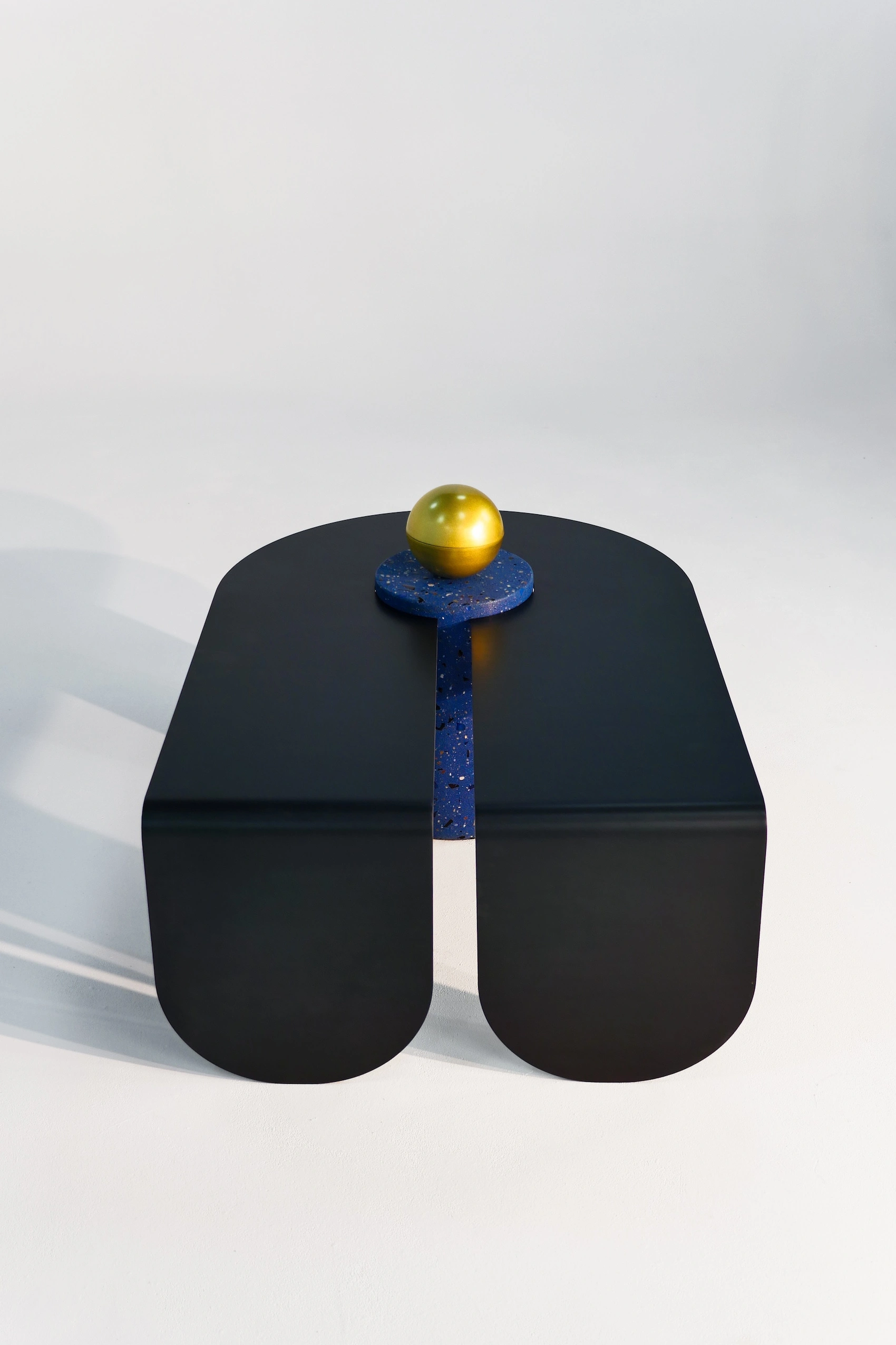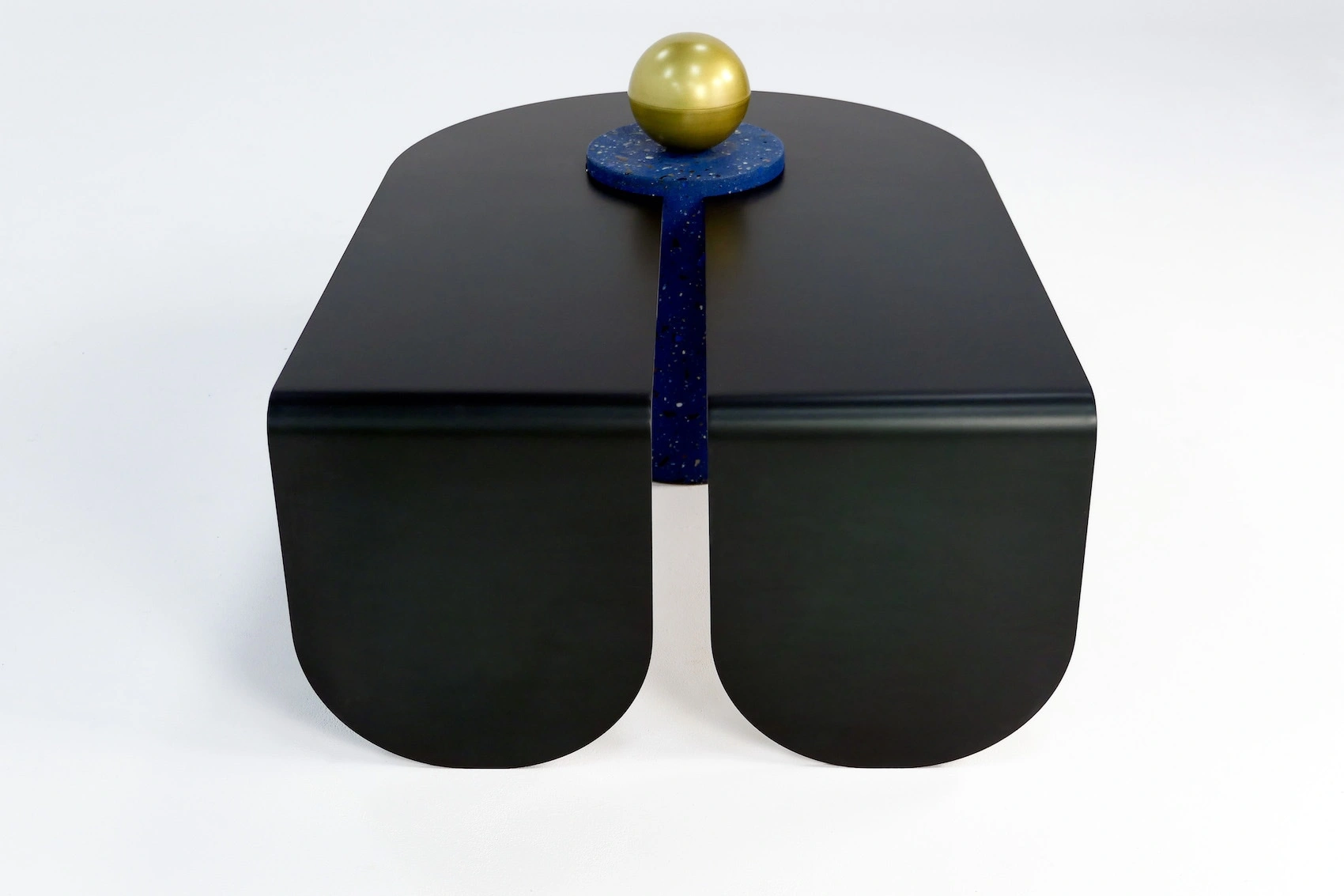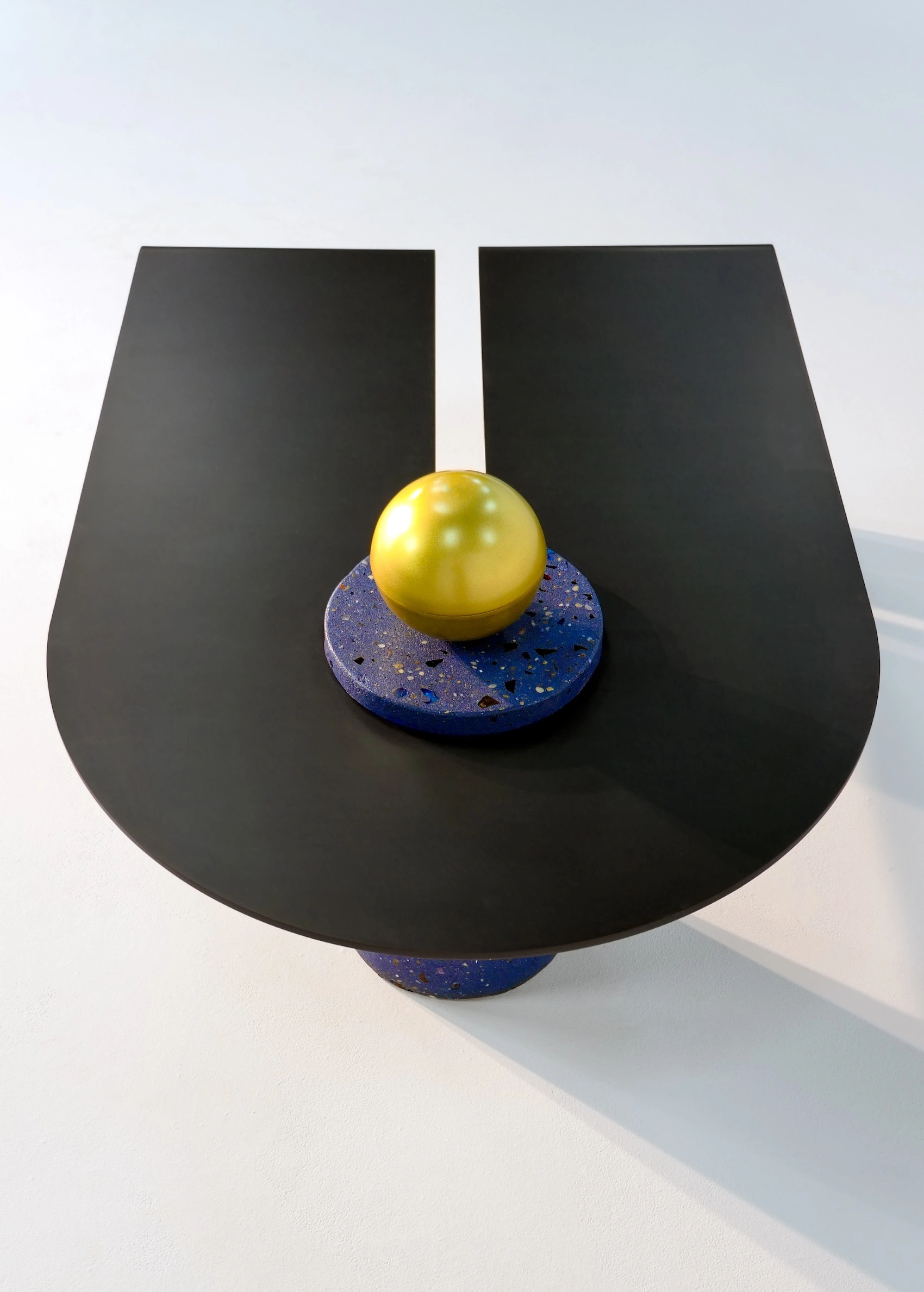 The table combines anodized aluminum, brushed brass, and blue-dyed terrazzo concrete. Each material holds its own presence, yet together they create a balance between cool precision and tactile warmth. Straight lines meet soft curves, primary forms collide with unexpected textures.