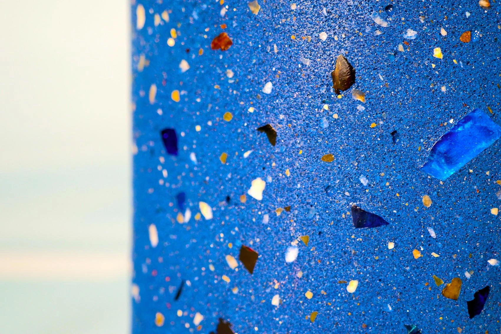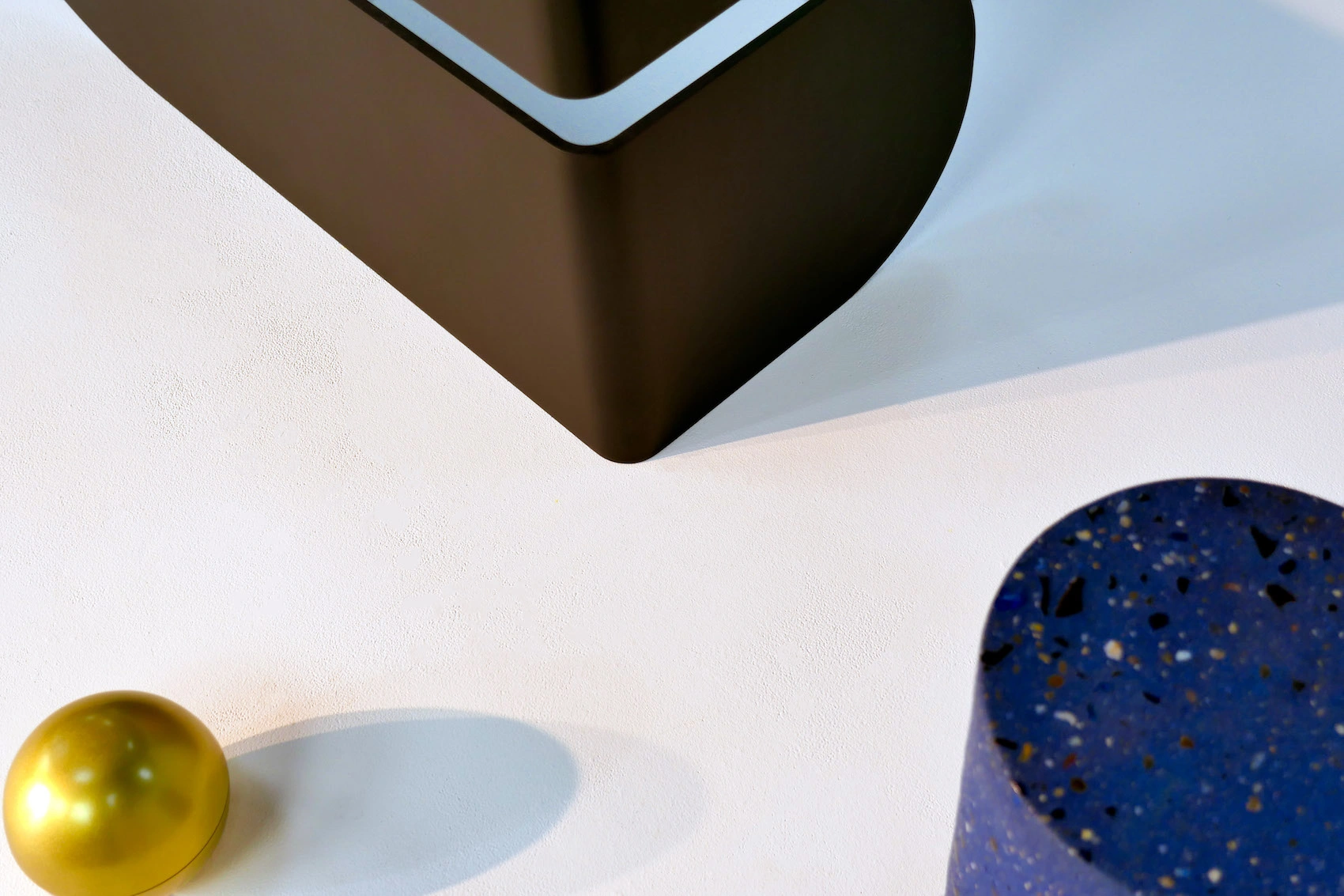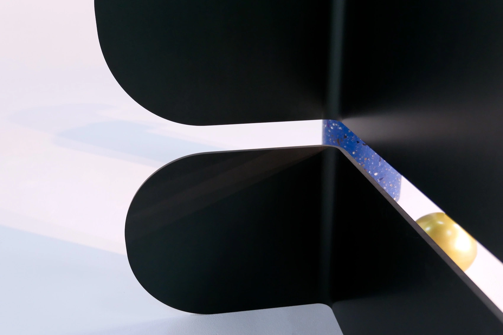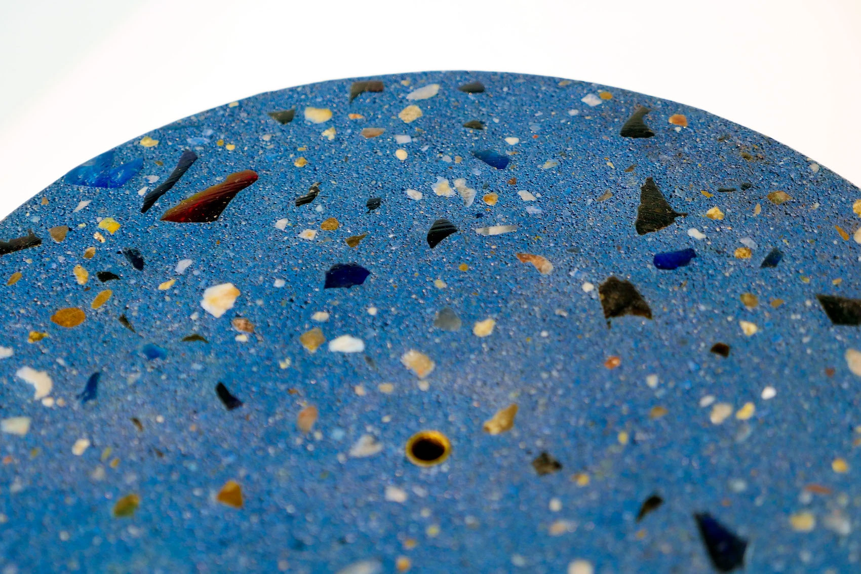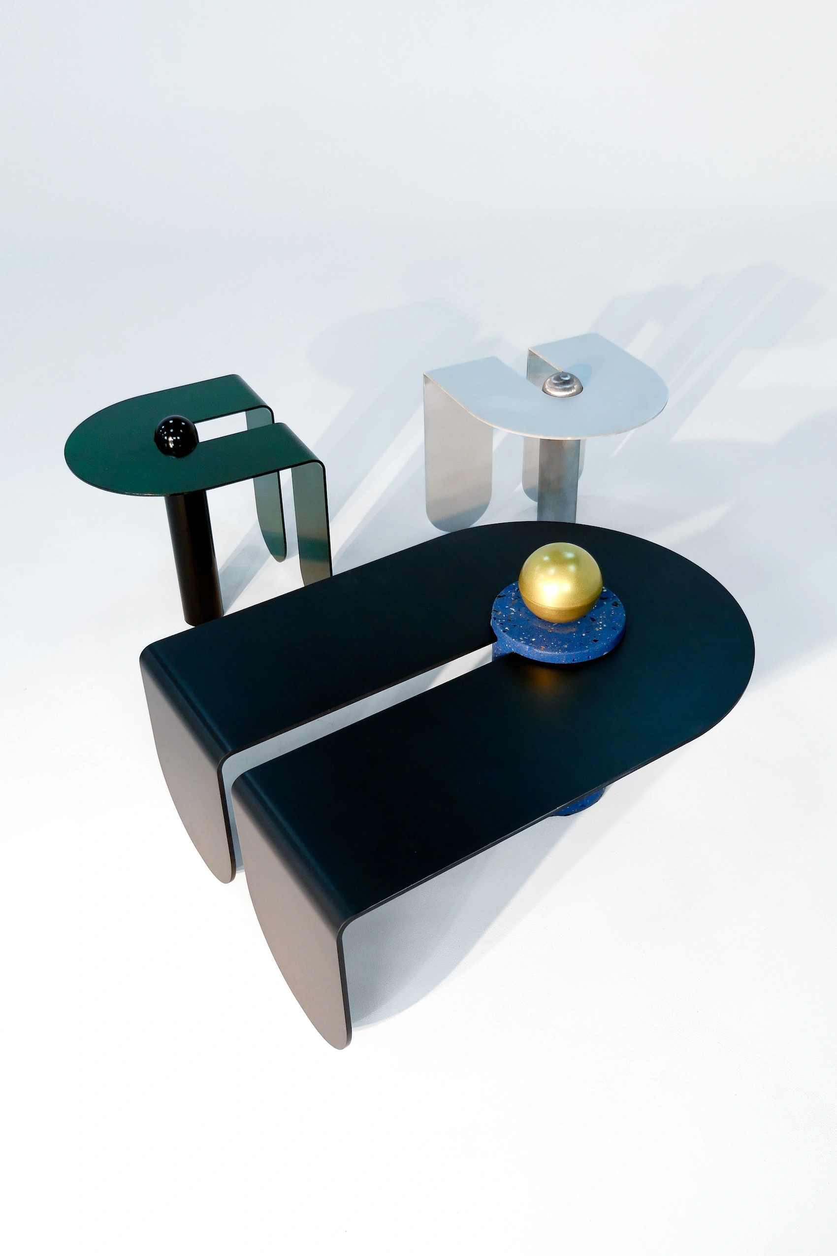 The table combines anodized aluminum, brushed brass, and blue-dyed terrazzo concrete. Each material holds its own presence, yet together they create a balance between cool precision and tactile warmth. Straight lines meet soft curves, primary forms collide with unexpected textures.