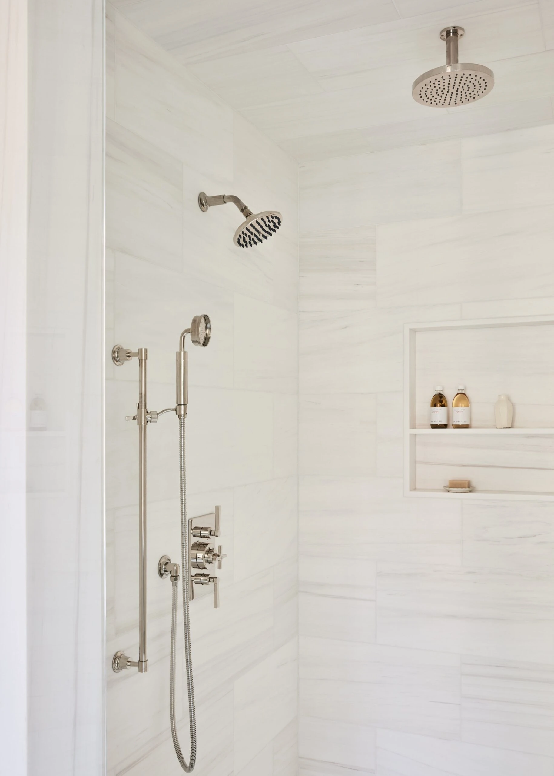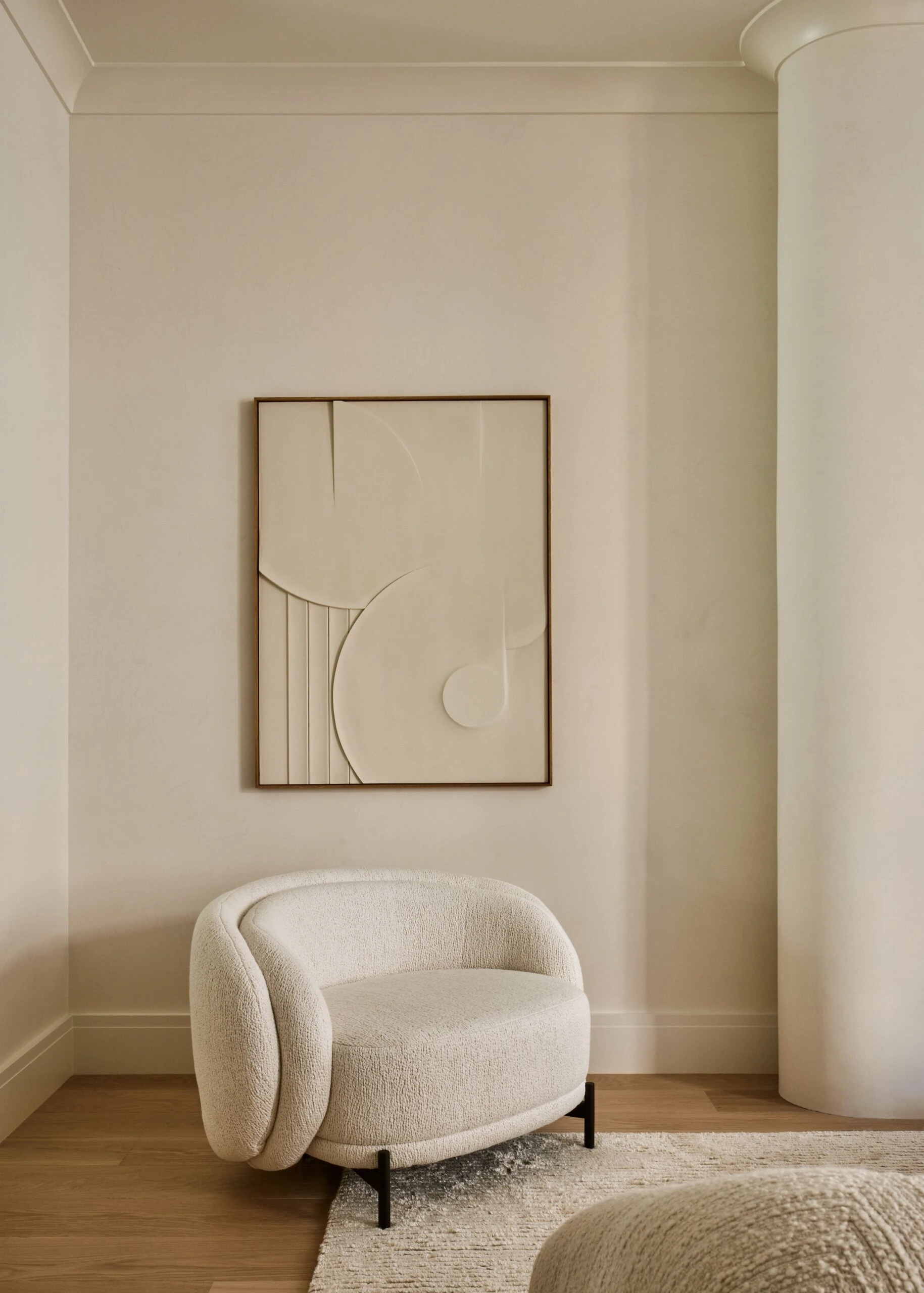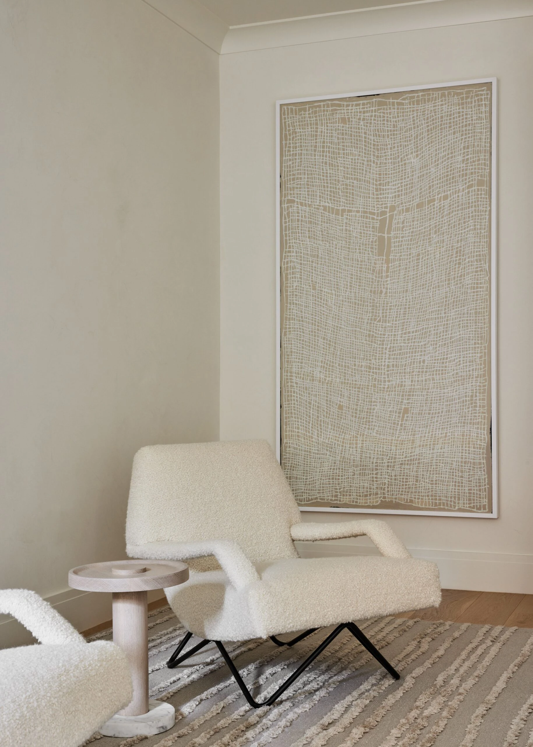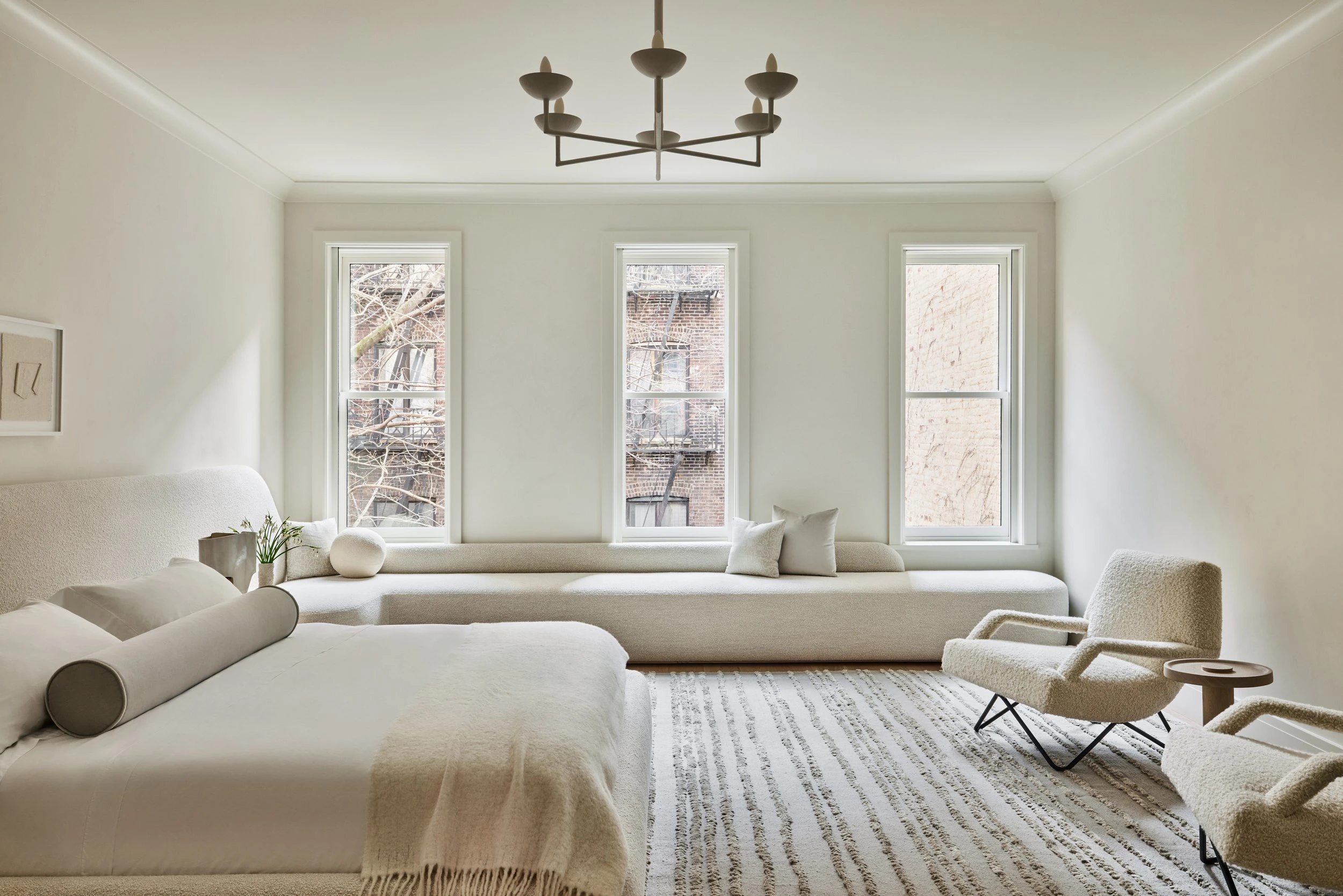 In the master bedroom, a custom boucle headboard extends along the wall and wraps around to form a bench. The continuous upholstered surface uses the same textile throughout, creating a soft boundary within the room.